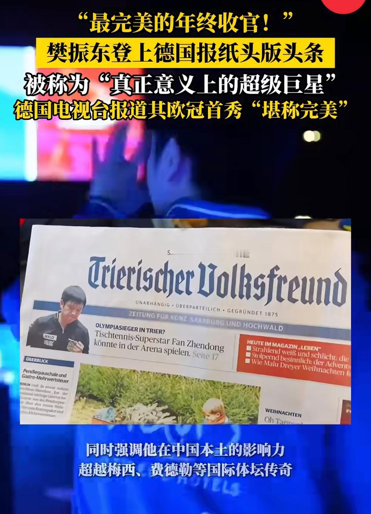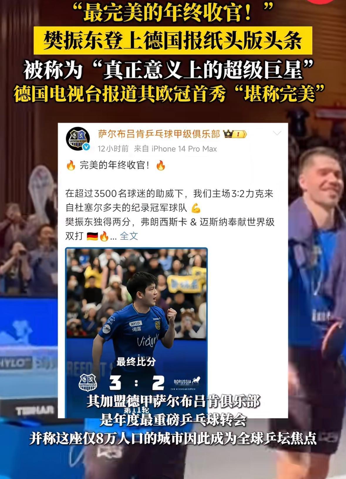 樊振东在德国,完美收官,德国报纸上称他为“超级巨星”,这真的是让人感动,东哥做到了,真正意义上的找到自己的位置! 十年,二十年,从咚咚到东哥,一个伟大经得起考验的运动员樊振东,称他为东哥,多么有力而坚定相信,不由自主慕强,樊振东是外协和我们国乒所有人的骄傲和自豪,羡慕有这样的好苗子,继续加油,无需畏惧,一切都会好的,继续加油下一程!