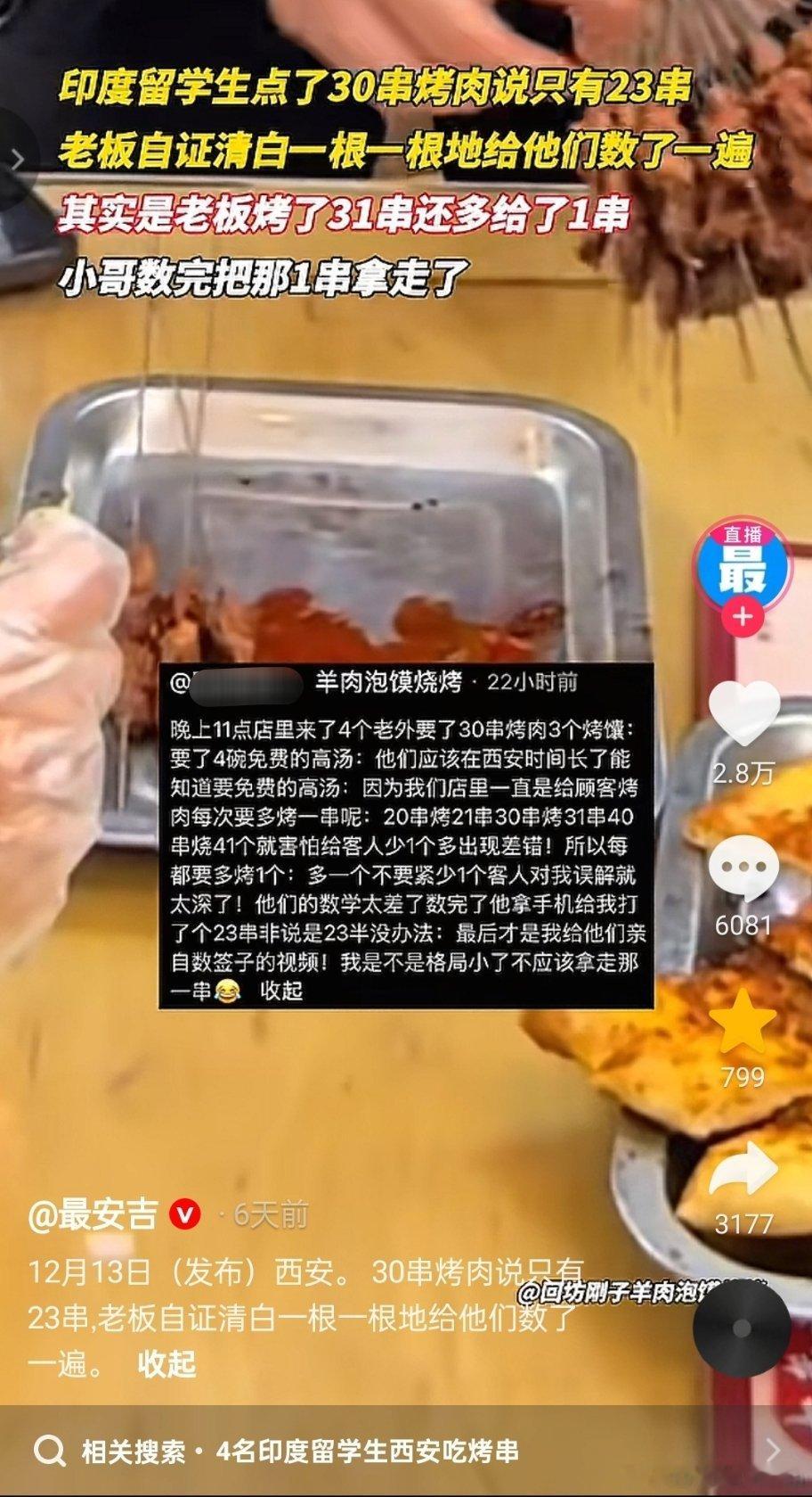 印度留学生点了30串烤肉,说只有23串。老板自证清白一根一根地给他们数了一遍。其实是老板烤了31串还多给了1串。小哥数完把那1串拿走了。