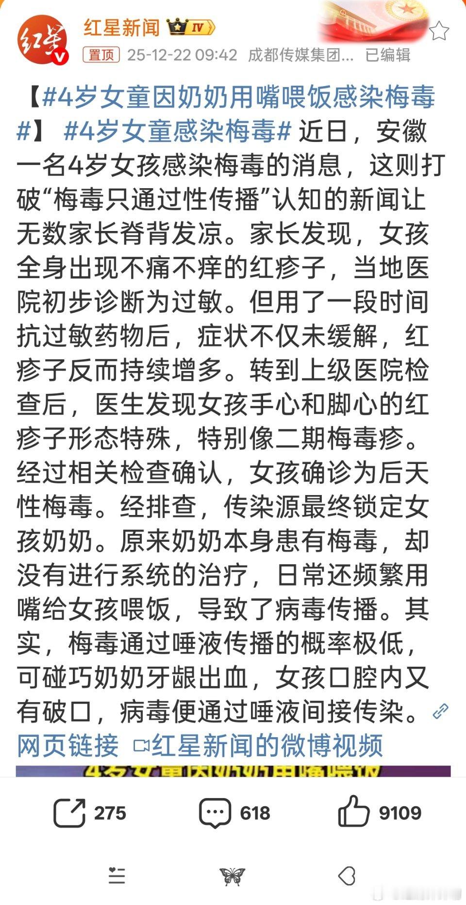 4岁女童因奶奶用嘴喂饭感染梅毒光看文字已经很让人不适了……这小孩太无辜了
