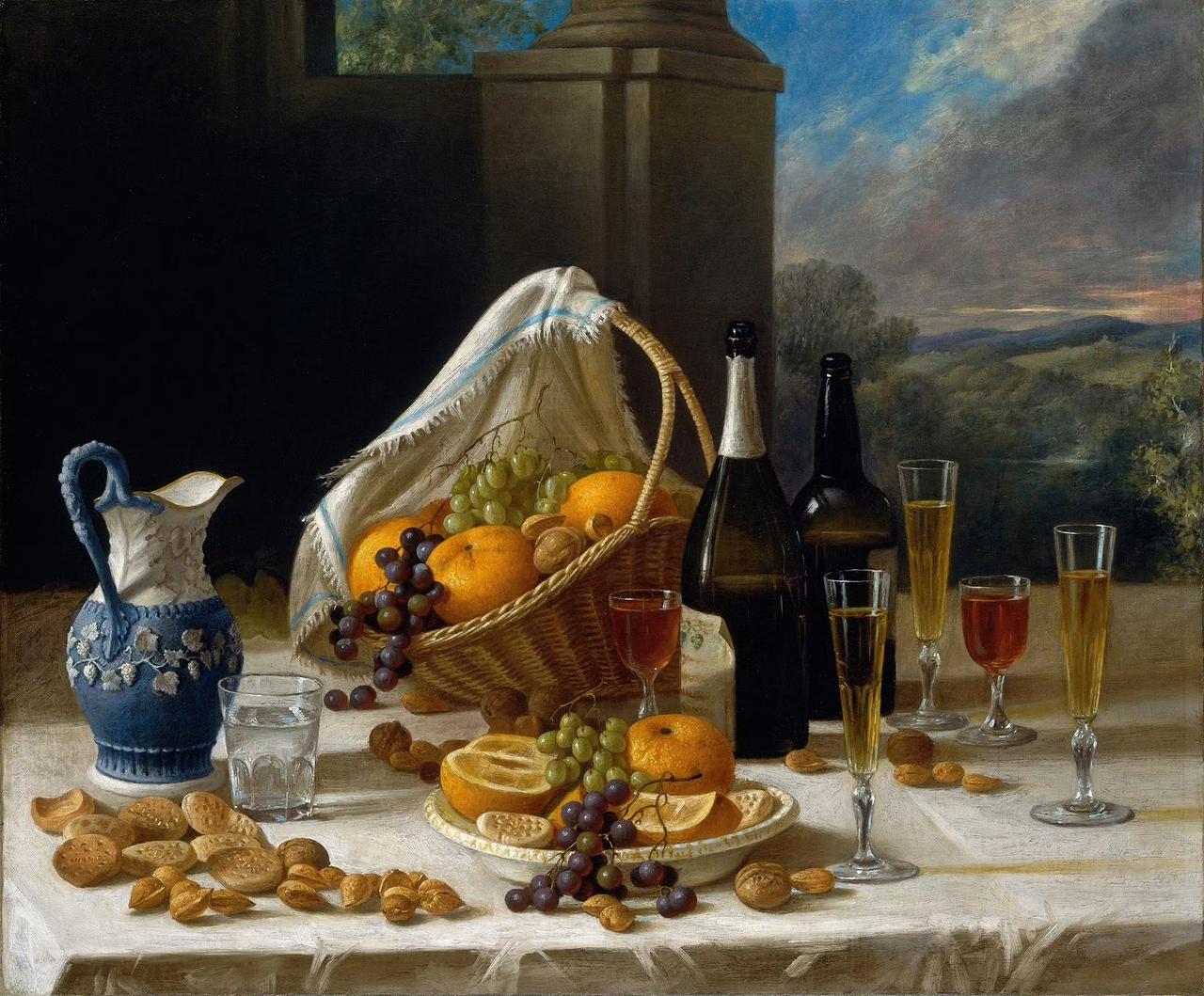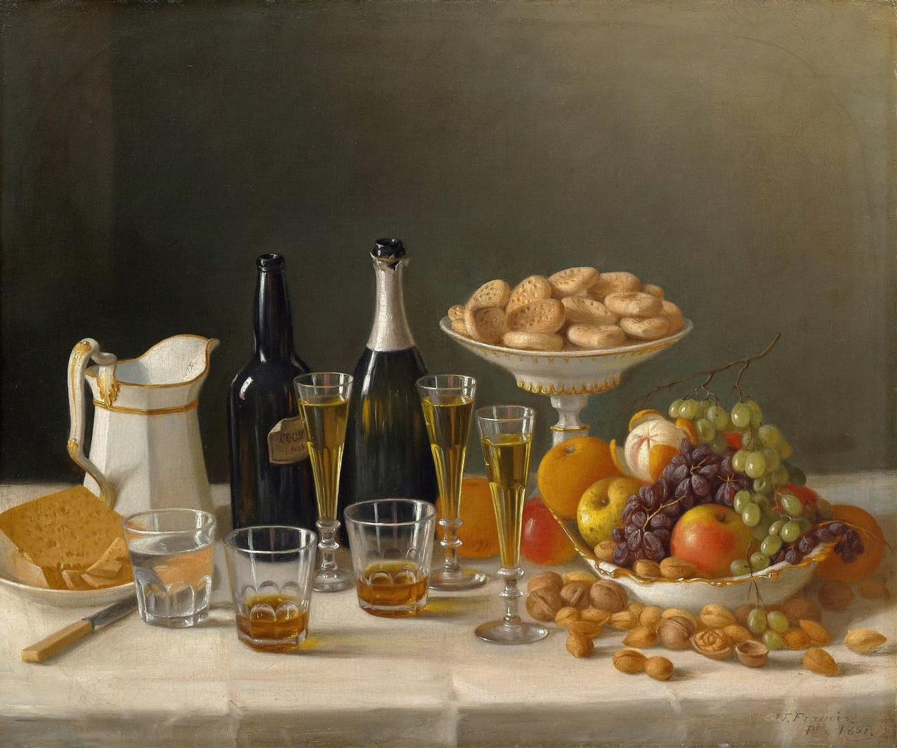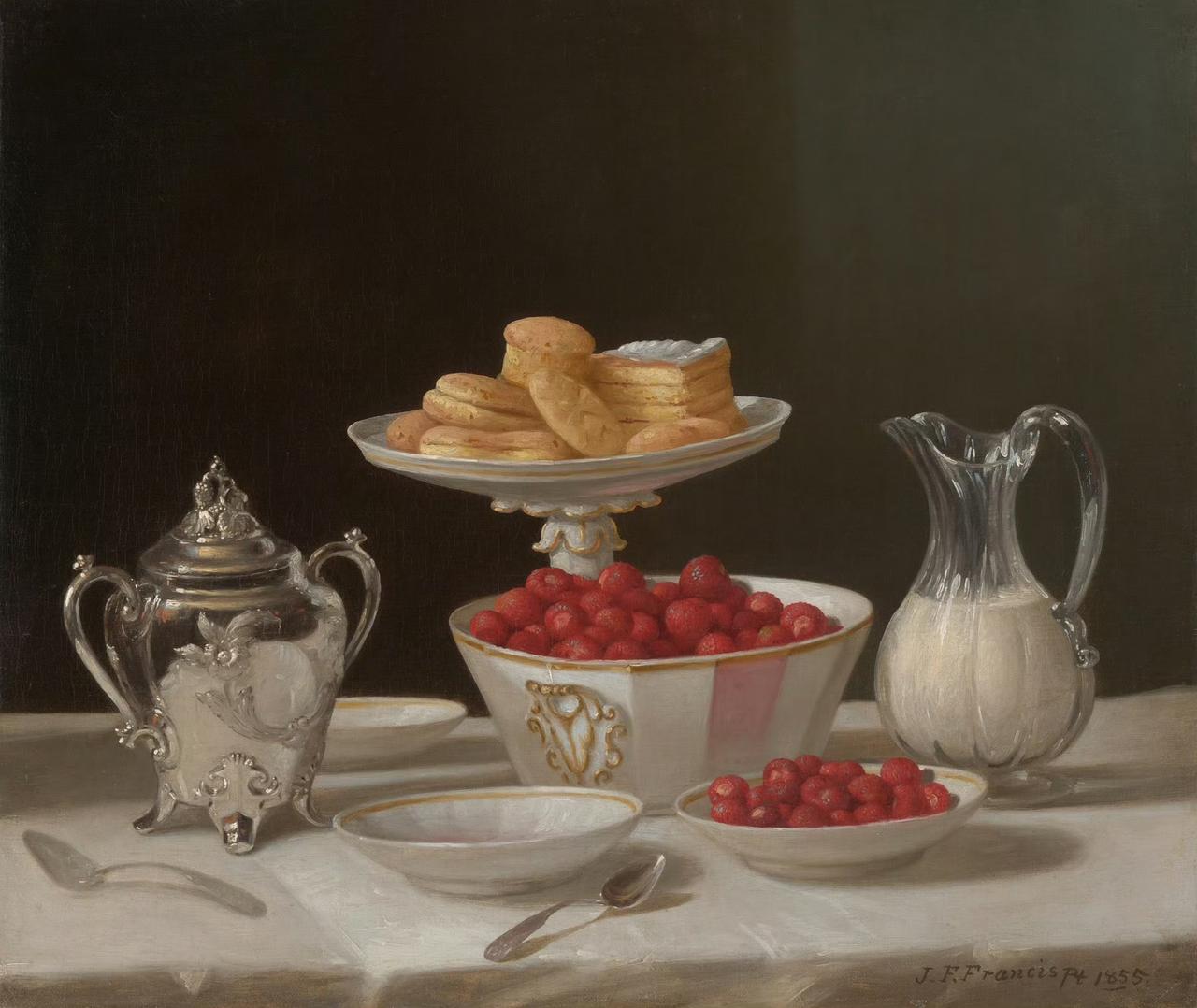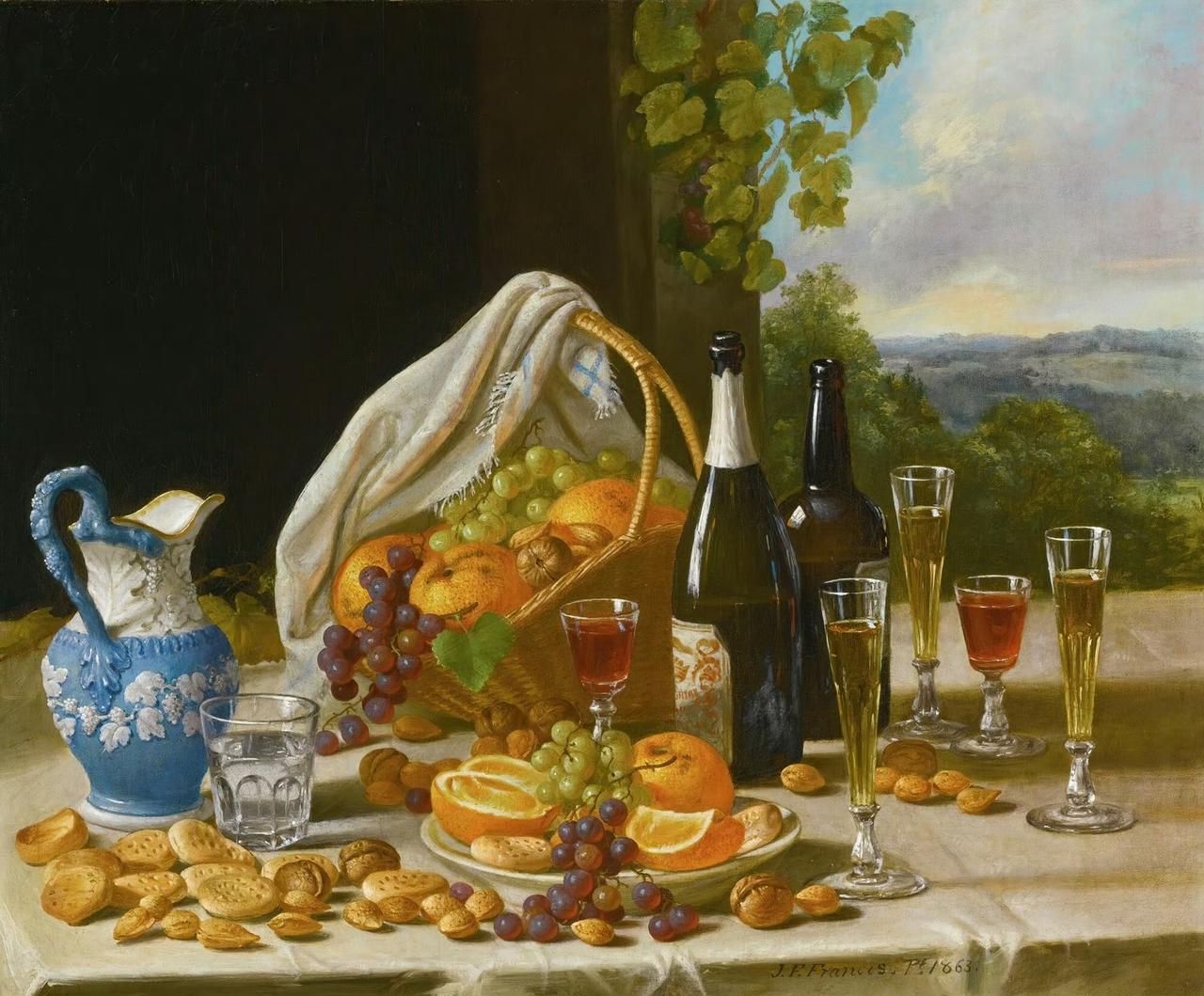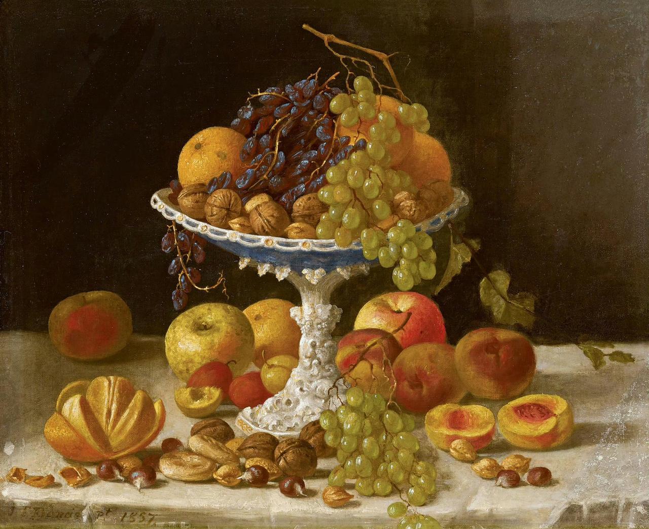 美国静物画家:约翰・F・弗朗西斯(John F. Francis,1808-86) · 弗朗西斯擅长创作静物画,以对细节的生动刻画而闻名。他的作品多以水果、餐具等为题材,通过细腻的笔触和精准的色彩运用,展现出物体的质感和光泽。 油画 静物