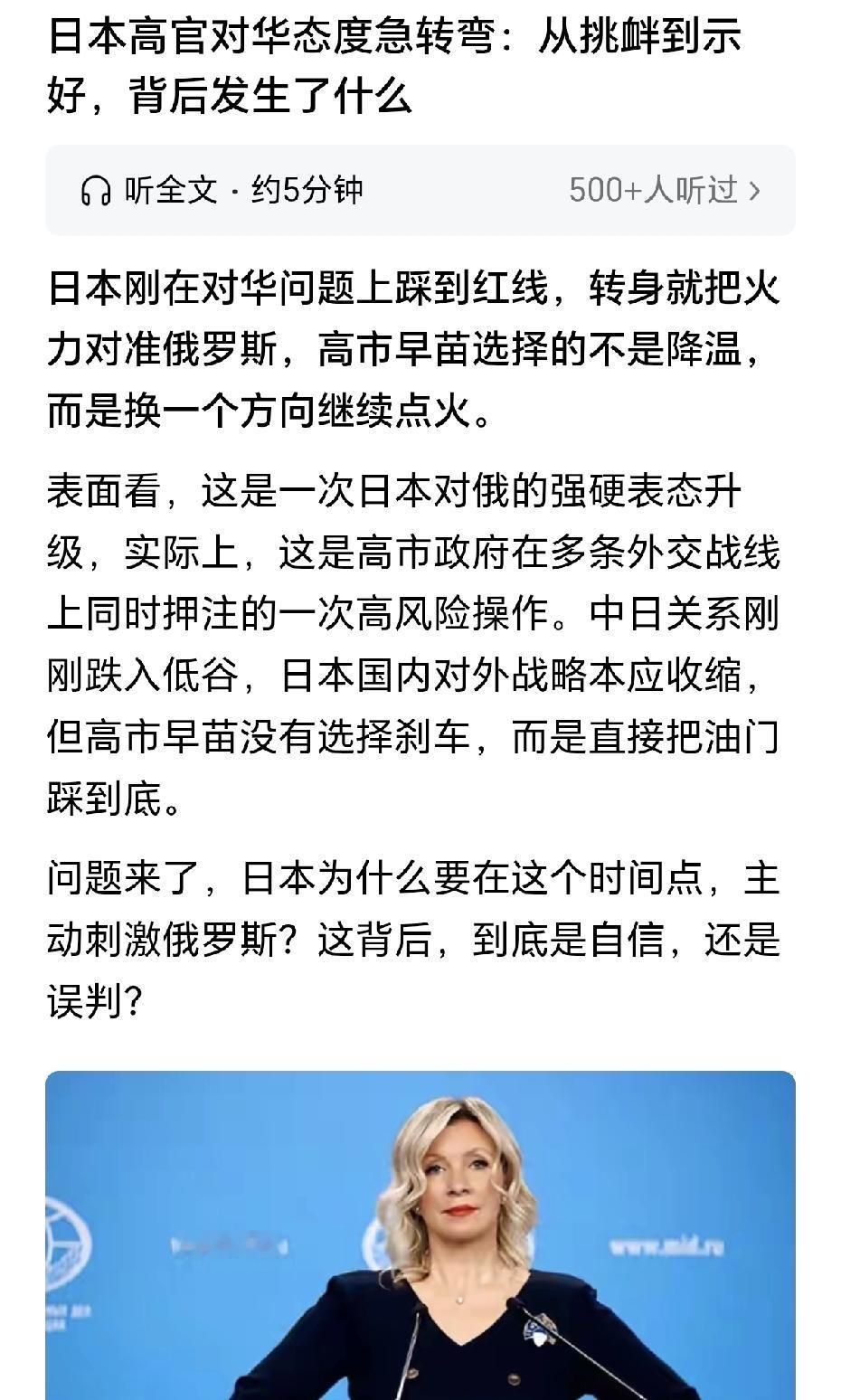 这两个新闻是不是矛盾?让人看不懂。 日本准备强行登钓鱼岛… 日本高官对华态度急转弯… 其实看完了新闻内容之后,就发现一点都不矛盾。 矛盾的是日本政府内部。 高市早苗不管是对华还是对俄,态度从始至终都没有太大的转变过,始终是那个非常强硬的右翼分子。 但是,日本政府内部不是铁桶一块,反对的声音依然存在。 不过,是不是红白脸的戏码就不好说了。