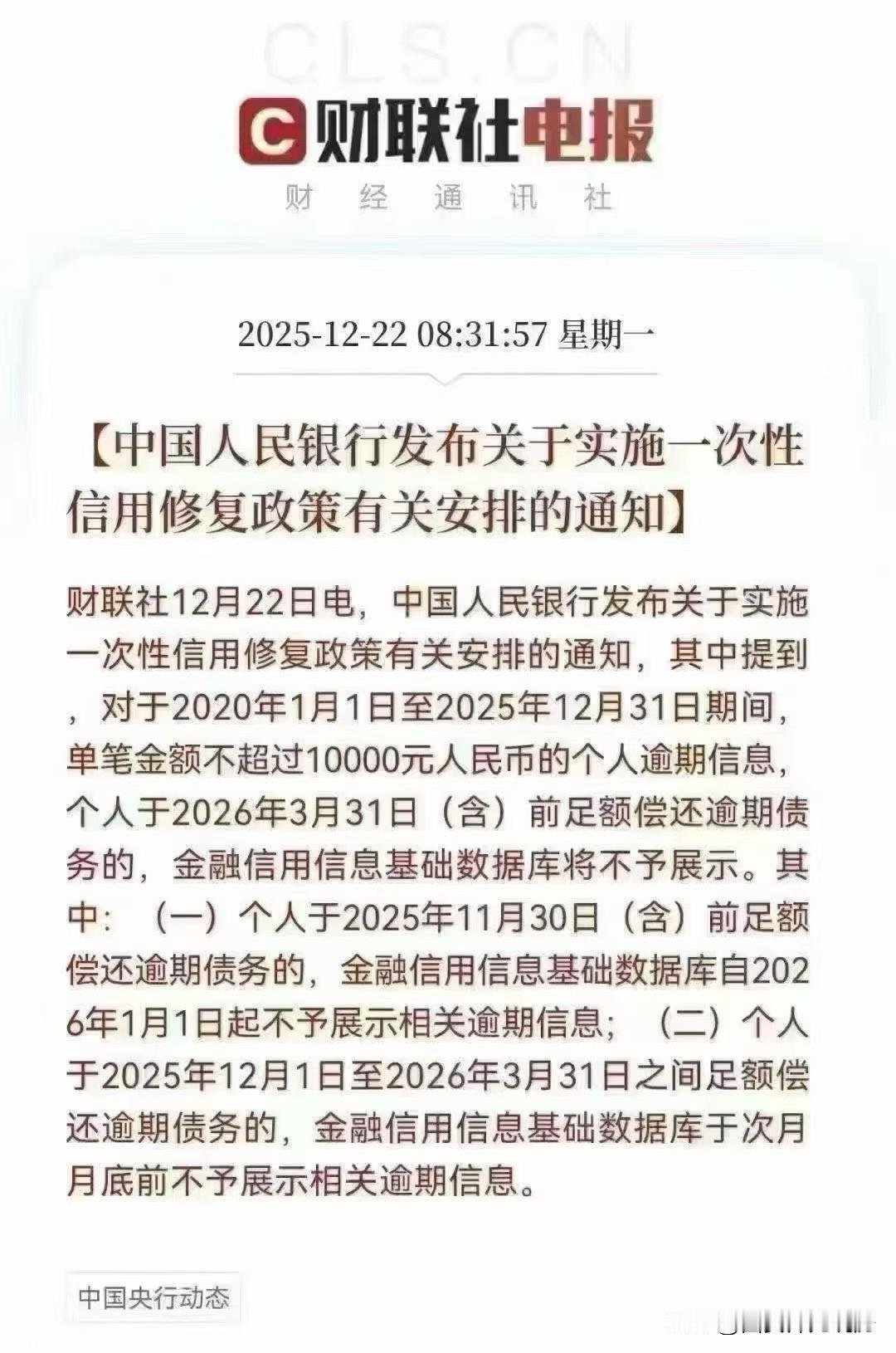 央行重磅发布一次性信用修复政策 助力个人信用重塑与经济回升 2025年12月22日,中国人民银行正式印发《关于实施一次性信用修复政策有关安排的通知》,针对新冠疫情后续影响下的个人信用修复需求,推出免申即享的一次性信用修复举措,为信用受损但积极履约的个人提供便捷重塑信用的路径,助力经济持续回升向好。 此次政策明确了四大核心适用条件:一是适用对象为金融信用信息基础数据库中记录的个人信贷逾期信息;二是逾期信息需产生于2020年1月1日至2025年12月31日期间;三是单笔逾期金额不超过1万元人民币;四是个人需在2026年3月31日(含)前足额偿还逾期债务。符合上述条件的逾期信息,将不再在征信报告中展示。 在实施节奏上,政策采取分阶段处理机制:2025年11月30日前结清欠款的个人,自2026年1月1日起相关逾期信息即停止展示;2025年12月1日至2026年3月31日期间结清的,征信系统将于次月月底前完成调整。值得关注的是,此次修复实行"免申即享"模式,由中国人民银行征信中心通过系统自动识别符合条件的逾期信息并统一处理,个人无需提交申请或证明材料,也无需支付任何费用。 为保障政策落地,央行明确了多项配套措施:征信中心将优化系统功能,协同金融机构建立咨询应答机制,对公众提出的核查申请在30天内妥善处理;各接入机构需规范信贷信息报送,畅通线上线下征信查询渠道,满足公众信用报告查询需求;2026年1月1日至6月30日期间,个人可在每年两次免费查询基础上,额外获得两次免费查询信用报告的机会,方便确认修复效果。 此次信用修复政策是央行统筹金融支持实体经济的重要举措,与2025年以来实施的适度宽松货币政策形成协同。在总量层面保持流动性充裕、推动融资成本稳中有降的同时,通过精准的信用激励政策,既帮助个人化解信用污点、恢复融资能力,也能间接提振消费与投资意愿。央行特别提醒,政策实施不收取任何费用,无需第三方代理,谨防各类诈骗行为,如遇违法违规线索可向央行分支机构或公安机关反映。 作为金融支持民生与稳定预期的重要举措,此次一次性信用修复政策的出台,将有效缓解部分个人的信用压力,提升金融服务的包容性。结合央行此前在货币政策、金融稳定等领域的系列部署,政策合力将进一步畅通金融血脉,为经济持续回升向好注入更多动力。征信新政策 征信恢复新规