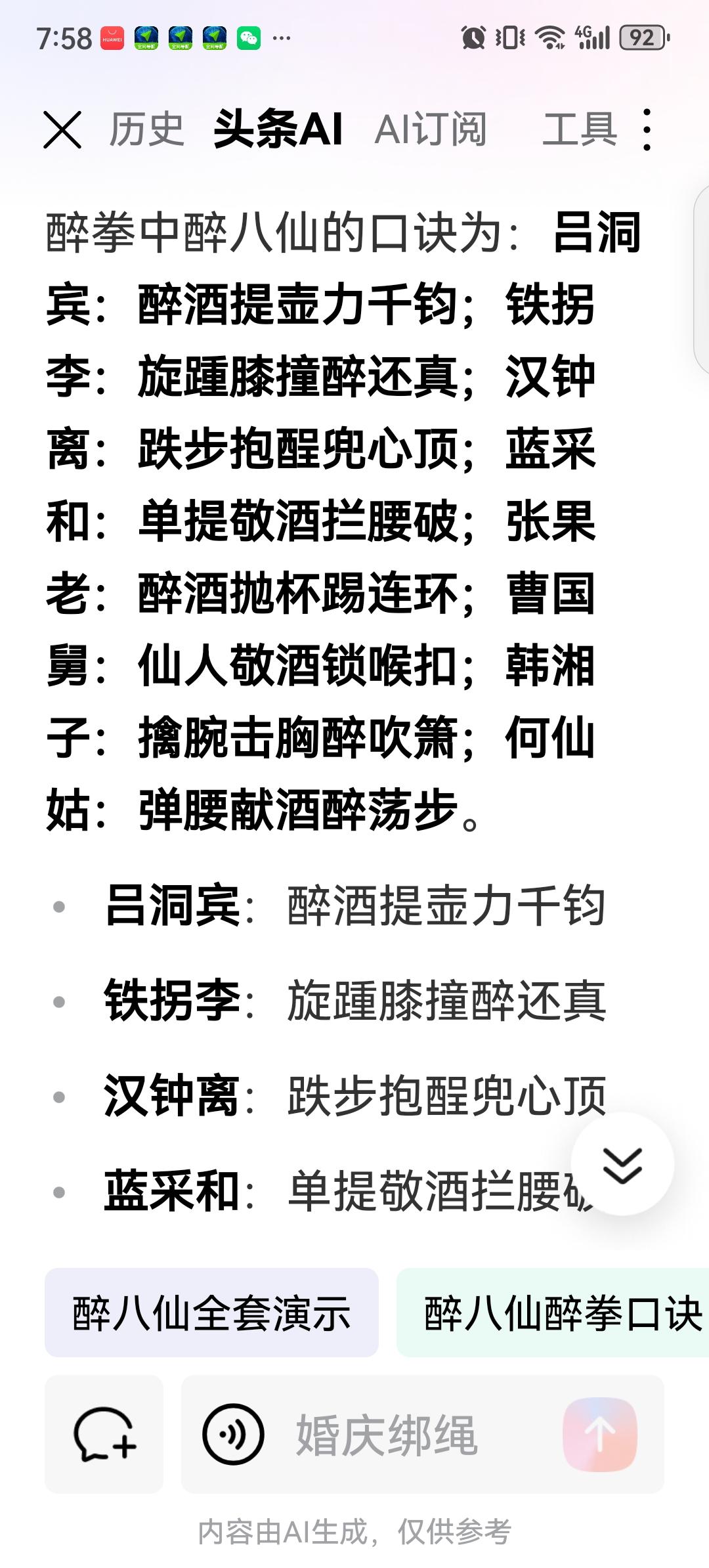 醉八仙拳:形醉神凝的武学智慧 醉八仙拳,作为中国武术中独树一帜的拳法流派,以其“形醉意不醉,步醉心不醉”的独特风貌,展现了中华武术“寓技于醉”的深邃智慧。这套拳法超越了单纯技击的范畴,成为一种身体艺术与哲学思辨的完美结合,在看似踉跄无序的动作中,暗含着严谨的技击逻辑与千年武学精髓。 形醉意醒:动静之间的攻防哲学 醉八仙拳的核心在于“无意之中是真意”——在外表看似醉态朦胧、毫无章法的表象之下,实则是高度清醒的战斗意识与精密计算的身体控制。这种“外松内紧、外柔内刚”的状态,恰如道家哲学中“大智若愚”的境界体现。练习者通过模仿八仙醉态,打破了常规武术动作的预期模式,使对手难以预判招式的起落变化,从而达到“出奇制胜”的效果。 拳诀“眼疾手快,形醉意醒,随机就势,避实就虚,闪摆进身,跌撞发招”精准概括了其战术精髓。这不仅是技术要诀,更是一种应对万变的处世智慧,体现了中国武术“以巧破力、以柔克刚”的深层哲学。 周身是法:多元一体的技术体系 醉八仙拳的技术体系丰富而精妙,形成了全方位、立体化的攻防网络: 手法上,刁、拿、采、扣如灵蛇吐信,劈、点、搂、插似暴雨骤至,在看似随意的挥洒中封缠拿打,令人防不胜防。 腿法中,蹬、缠、勾、挂暗藏玄机,撩、踢、弹、踹变幻莫测。尤以“勾挂腿”与“缠丝腿”最具特色,常在身体失衡的瞬间骤然发出,借旋转之势增强力道。 步法以踉跄步为核心,提、落、进、撤、碎、击、碾、盖诸法交融,看似跌撞不稳,实则每一步都暗合攻防转换之机,创造出独特的节奏与距离感。 眼法讲究“视、瞧、藐、瞟”,以迷离眼神掩盖真实意图,达到迷惑对手、隐蔽杀招的目的。 身法中的挨、撞、挤、靠,将全身化为武器,在近身缠斗中发挥极大威力,体现“周身无一处不打人”的至高境界。 化险为夷:跌扑翻滚中的生存智慧 醉八仙拳的跌法艺术堪称武术一绝,将被动倒地转化为主动攻击的契机。佯跌诱敌深入,硬跌以刚破刚,化险跌转危为安——每一种跌法都是战略选择。 其跌扑翻滚动作体系极为丰富:从刚猛如“扑虎”“栽碑”,到灵巧如“鹞子翻身”“鲤鱼打挺”;从地面控制技“金剪绞”“乌龙绞柱”,到闪避反击技“拨浪子”“剪腿跌”。这些动作不仅锻炼武者超常的身体协调性与抗冲击能力,更培养了一种“处变不惊、化险为夷”的战斗心态,将每一次失衡都转化为新的发力起点,完美诠释了“反者道之动”的东方智慧。 神传意发:形神合一的修炼境界 醉八仙的练法强调“神传意发,心动形随,步碎身活,形神合一”,这要求练习者不仅要掌握外在招式,更要领悟内在神韵。通过长期修炼,达到意识与动作的高度统一,使每一招每一式皆由心发,无刻意而为,却处处合乎法度。 这种“醉态”实则是高度专注下的身体自由,是摒弃僵化思维后的创造性发挥。练习者在此过程中,不仅锻炼了身体素质,更培养了临机应变、顺势而为的思维能力。 文化延伸:文学艺术中的醉拳意象 醉八仙拳的文化影响力早已超越武术范畴,衍生出众多艺术化的套路表现:“太白醉酒”展现诗仙的潇洒不羁,“武松醉酒”演绎英雄的豪迈刚烈,“燕青醉酒”体现灵巧机变,“鲁智深醉打山门”彰显霸烈勇猛。这些套路将历史人物的性格特质融入拳法风格,使武术成为传递人物精神、讲述文化故事的特殊语言。 醉八仙拳如同一个流动的文化符号,在扑跌滚翻、摇曳踉跄之间,承载着千年来中国人对“藏巧于拙”“以柔克刚”生命智慧的深刻理解。它不仅仅是搏击之术,更是一门在动态平衡中感悟天地之道的身心艺术,在似醉非醉、虚实相生的境界里,展现着中华武术独有的美学深度与哲学高度。
