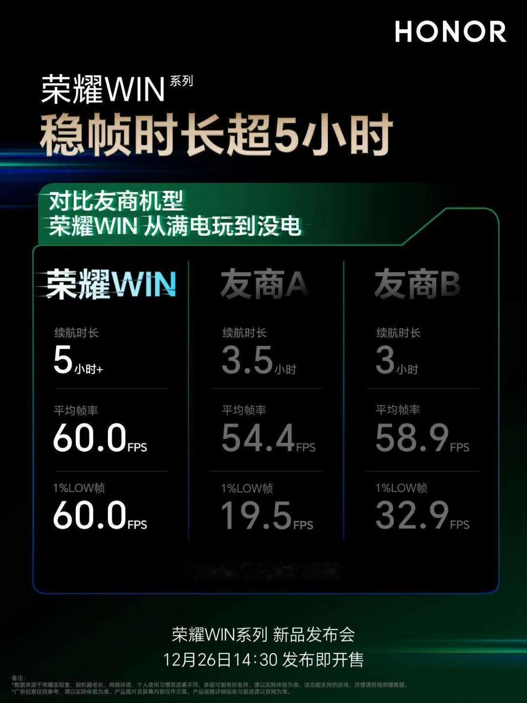 荣耀WIN系列续航10000夯到顶!荣耀WIN系列荣获多家权威媒体榜单续航TOP1! 全系搭载史上最大10000mAh巨无霸青海湖电池,持续稳赢无需CD,Carry全场续航顶满。人送外号:“卡顿终结者”、“续航灭霸”。稳帧超5小时,帧率走出一条直线。游戏在变,地图在变,流畅不变。旗舰芯狂暴性能:0卡顿,0抖动,0拖影。让你赢得干脆,让对手无话可说!巨无霸电池:一直玩,一直稳,无限稳。