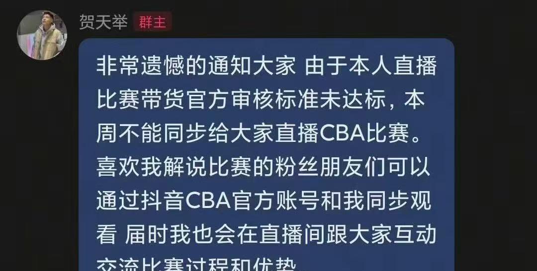 变味了!CBA直播竟然还有带货考核! 中国男篮名宿贺天举在近期却告知粉丝他失去了直播比赛的权利,原因是他没有完成直播带货考核,直到这时候球迷才知道直播比赛竟然还有带货指标,CBA比赛完全变了味!