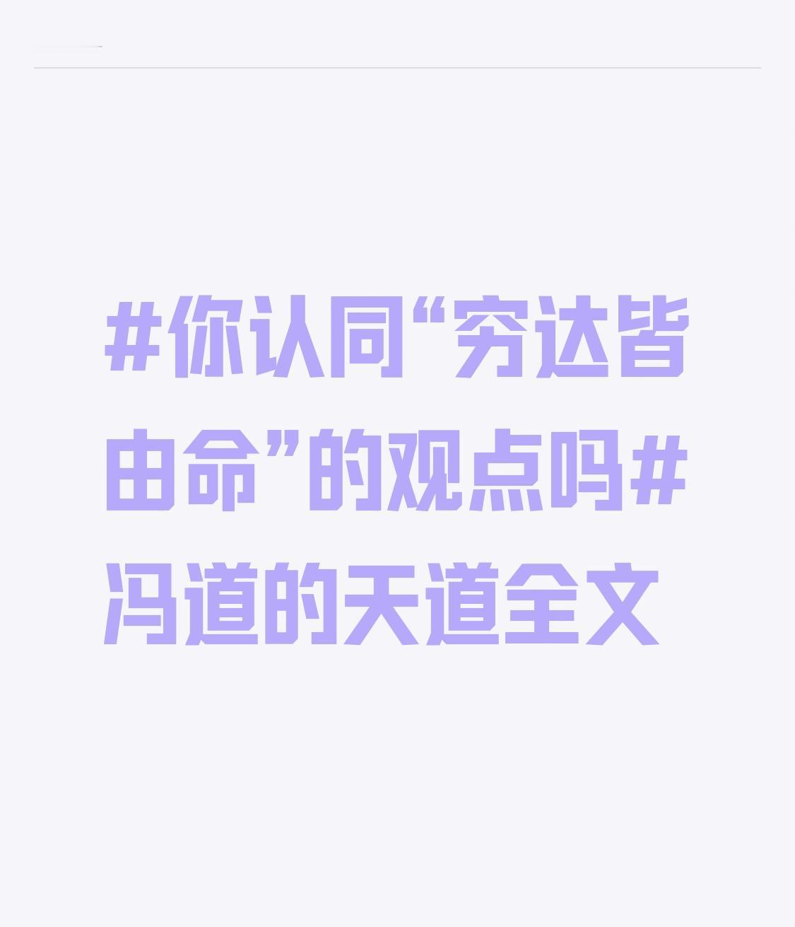 “穷达皆由命”出自冯道的《天道》:“穷达皆由命,何劳发叹声;但知行好事,莫要问前程。冬去冰须泮,春来草自生;请君观此理,天道甚分明。”对于“穷达皆由命”,我觉得不能完全认同。 冯道历仕四朝十帝,在乱世中全身而退,有人赞他通透,有人骂他圆滑。从诗本身来看,“冬去冰须泮,春来草自生”,坏事到尽头好事自然发生,有一定哲理。2024年清华实验显示,默写《天道》的白领面对困境时压力激素下降幅度更大。但如果一味认为穷达由命,可能会陷入消极。“但知行好事,莫要问前程”,我们还是要积极行动,不能完全依赖命运安排。
