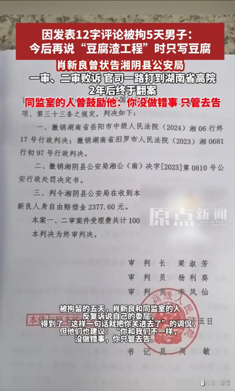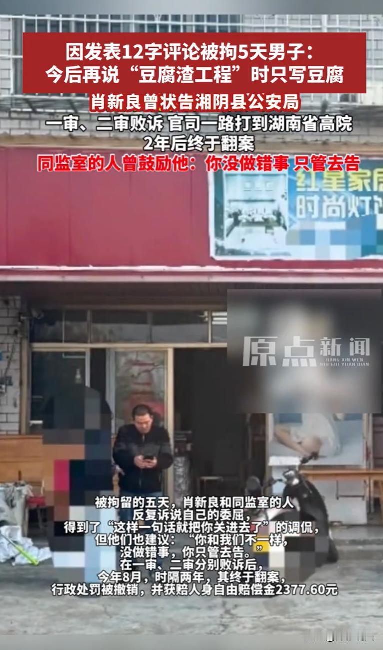 湖南湘阴,一家具店主在刷抖音时,看到一则当地施工事故视频,联想到曾见过的统一招牌改造,便评论道:“还在搞豆腐渣工程,统一招牌?”三天后,警方上门将其带走,以“寻衅滋事”为由处以行政拘留5日。店主不服处罚,先后提起行政复议和行政诉讼,但一审、二审均败诉。但男子没有放弃,继续坚持申诉至省高院,终迎来转机。维权期间,男子备受压力,直言今后评论类似事件可能只写“豆腐……”二字。 2023年7月4日,49岁的家具店老板肖新良在店内闲暇时刷着短视频,一条约30秒的内容划过:消防车警灯闪烁,停在一栋楼下,救援人员在脚手架上忙碌。字幕显示,当地三井头步行街发生一起施工事故。 肖新良对那片老城区有印象,那里曾进行过统一的招牌改造,联想到自己见过的类似工程质量,他心中泛起疑虑,手指在评论框敲下:“还在搞豆腐渣工程,统一招牌?” 末尾,他特意加了一个问号。 十二个字,一个疑问,发出后,他便继续忙活店里的事,未将此放在心上。 三天后的上午,警方来到肖新良的家具店。 起初,肖新良以为是顾客,直到对方表明来意,他当即表示可以删除评论,但警方要求他“上车说”。 据肖新良回忆,上车后情况突变,他被控制并收缴手机。他抗议称这是违法,但未被理会。 随后,肖新良被带往指定医院进行拘留前的体检,完成笔录等程序。 当天傍晚,肖新良被送入拘留所。直到此时,肖新良他才真切意识到,自己因为那句评论,将被行政拘留五天。 拘留所里的时间格外漫长,肖新良辗转难眠,食不下咽,内心充满不解与愤懑。“我就是气啊。” 肖新良向同监室的人诉说自己的遭遇,得到的是惊讶与同情。有人调侃“这样一句话就把你关进来了”,也有人鼓励他:“你和我们不一样,没做错事,你只管去告。” 肖新良被拘期间,孩子不停问“爸爸去哪了”,妻子只能含糊搪塞。 肖新良回家后,孩子不知从哪听说了真相,竟时不时对着爸爸念:“你坐过牢嘞,你被关起来坐过牢嘞!” 拘留结束,肖新良决定维权,先申请行政复议,未果。 约一个月后,肖新良正式向法院起诉县公安机关,请求撤销行政处罚。 不过,一审法院和二审法院均认为肖新良在未核实视频内容真实性的情况下,使用“豆 腐 渣工程”影射统一招牌工程,系发泄不满的不当言论。 同时,肖新良的评论与他人恶意评论“具有延伸性、扩展性”,对当地政 府及领 导产生了“一致性的负面影响”,破坏了社会秩序,构成寻衅滋事。 基于此,肖新良的诉讼请求被驳回。 接连败诉,让肖新良感到“整个 世 界都是黑 暗的”。 为了佐证自己评论并非凭空捏造,肖新良还特意去视频拍摄地查看,发现那里砌的墙确实影响了消防通行,且墙面有粉块脱落迹象,当地也确实施了统一招牌。 肖新良坚信,现场情况表明,我评论的内容没有一个字是错的。 随后,肖新良继续申诉。 2024年10月,湖南高院裁定提审此案。 2025年6月,经过调查询问,湖南高院作出了截然不同的认定。 再审法院会如何判决呢? 《治安管理处罚法》第五条规定,治安管理处罚必须以事实为依据,与违反治安管理行为的性质、情节以及社会危害程度相当。 第二十六条 有下列行为之一的,处五日以上十日以下拘留,可以并处五百元以下罚款;情节较重的,处十日以上十五日以下拘留,可以并处一千元以下罚款:……(四)其他寻衅滋事行为。 再审法院指出,原处罚决定及一审、二审判决中,将肖新良的评论行为定性为“发泄不满情绪”、“不当言论”,并认定其评论与他人的“恶意诋毁评论”具有“延伸性、扩展性”,对当地政府及领导产生了“一致性的负面影响”。 然而,肖新良的个人评论内容是独立的,其下他人的回复内容并非肖新良所发或授意,亦无证据证明肖新良对该回复进行了点赞、附和或进一步传播以扩大影响。 在法律上,不能仅因不同网友的评论在内容上存在某种关联性或情绪倾向,就简单地将他人言论产生的影响归责于最初的评论者,这违背了责任自负的基本法律原则。 公安机关未能提供充分证据证明肖新良的行为直接、必然地导致了其所述的“破坏社会公共秩序”的严重后果。 此外,肖新良的评论虽有不妥,但并无具体指向对象,其评论下仅有六人点赞、一人回复,造成的社会不良影响轻微,此类情况应予批评教育,直接适用拘留措施,违反过罚相当原则。 法院认为,公安机关处罚决定认定事实不清,证据不足,过罚明显不当,应予撤销 最终,再审法院判决撤销原一、二审判决,撤销对肖新良的行政处罚决定。 另,肖新良因错误拘留,也拿到了相应赔偿金2377.6元。 但是,对于肖新良,正 义虽至,伤 痕犹在。正如其所说,以后如果再评论类似事情,可能只会写“豆腐……”后面加一串省略号,“不写那么直接”。 对此,您怎么看?