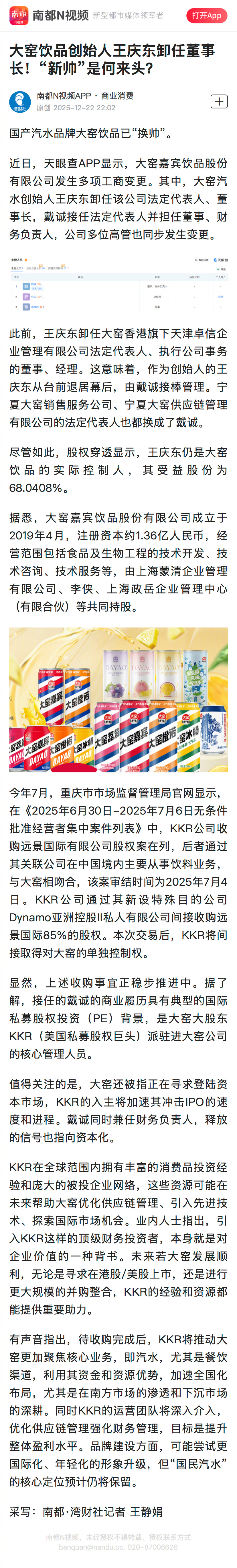 #大窑创始人王庆东卸任董事长#【大窑饮品创始人王庆东卸任董事长!“新帅”是何来头?】国产汽水品牌大窑饮品已“换帅”。近日,天眼查APP显示,大窑嘉宾饮品股份有限公司发生多项工商变更。其中,大窑汽水创始人王庆东卸任该公司法定代表人、董事长,戴诚接任法定代表人并担任董事、财务负责人,公司多位高管也同步发生变更。此前,王庆东卸任大窑香港旗下天津卓信企业管理有限公司法定代表人、执行公司事务的董事、经理。这意味着,作为创始人的王庆东从台前退居幕后,由戴诚接棒管理。宁夏大窑销售服务公司、宁夏大窑供应链管理有限公司的法定代表人也都换成了戴诚。尽管如此,股权穿透显示,王庆东仍是大窑饮品的实际控制人,其受益股份为68.0408%。据悉,大窑嘉宾饮品股份有限公司成立于2019年4月,注册资本约1.36亿人民币,经营范围包括食品及生物工程的技术开发、技术咨询、技术服务等,由上海蒙清企业管理有限公司、李侠、上海政岳企业管理中心(有限合伙)等共同持股。南都·湾财社记者 王静娟
