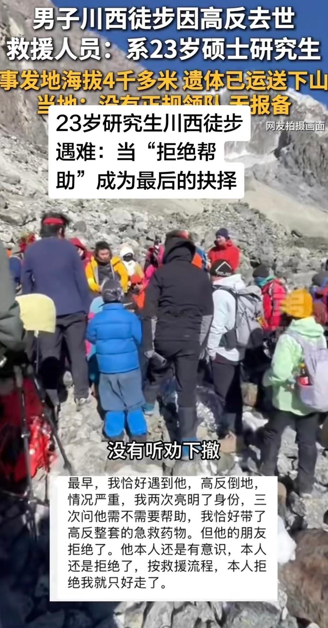 23岁研究生川西高原徒步突发高反去世,该男子毫无户外徒步经验,出事地点是甘孜州田海子山冰川,海拔4000多米,事发12月21下午1点。据当时在场的人说,男子出现高反后,路过的人建议他下撤,但是没有听劝。在出现反应后,旁边的驴友说拿高反的药救他,他也拒绝了。上次有个江苏的女孩徒步4000多米的高原,幸好遇到两个医生捡回一条命。怎么有如此之多无知无畏的人呢?挑战大自然,不是拿生命开玩笑,不负责任。高原徒步一定要循序渐进,从2000米到4000米一步步来,从简单路线,再慢慢加码,而不是直接一上来进入死亡模式。登山事故 丹巴县驴友遇难