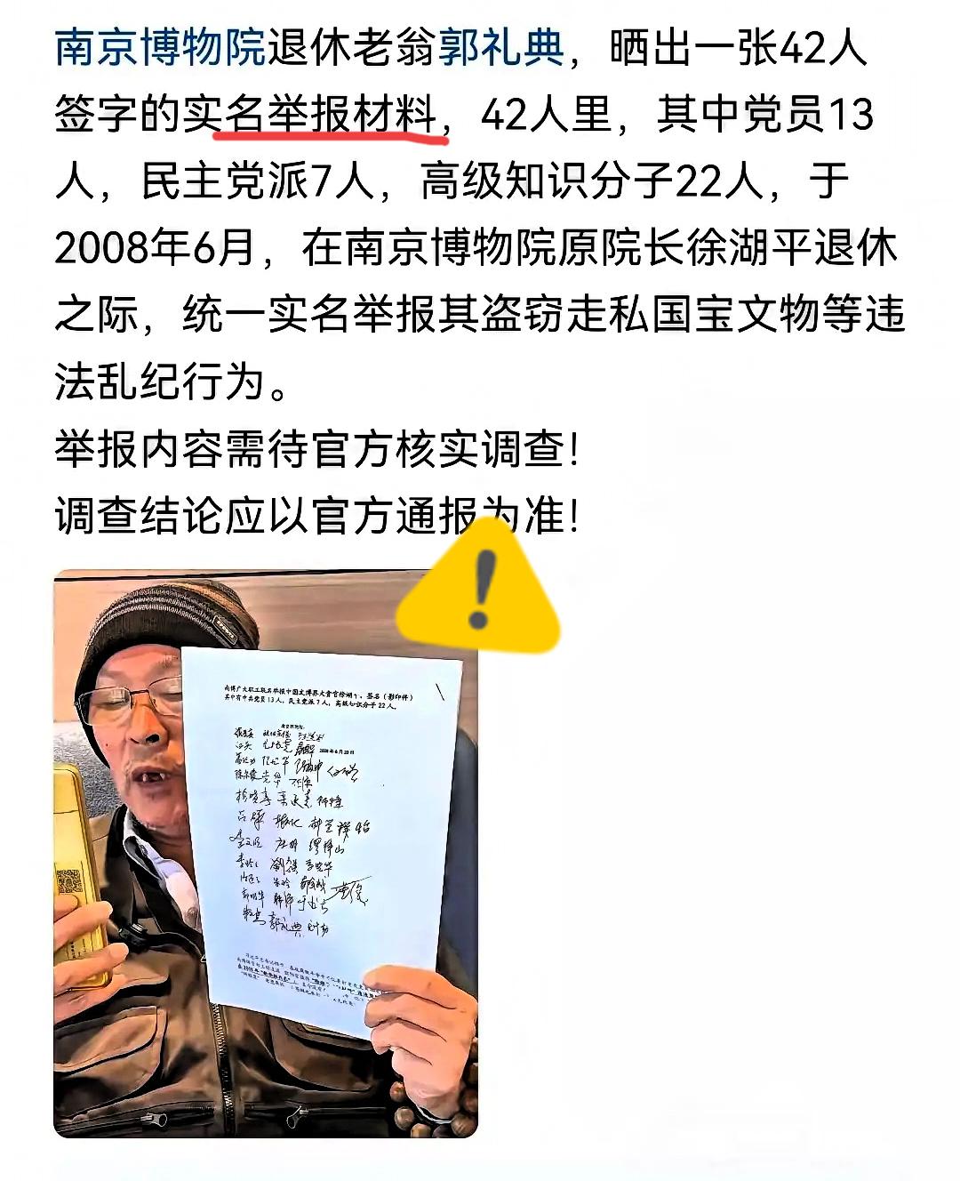 一个省级博物院,有42个人联名举报徐湖平院长私吞文物,竟然没有下文。一个博物院,总共才能有多少个职工,42人,应该是多数了。 退休近二十年的院长还能安稳领高薪?这事细想真的让人脊背发凉! 所谓的“照章办事”,根本就是权力闭环下的暗箱操作。徐湖平一边当南博院长,一边兼着文物总店法人,自己签字把文物从博物馆调到自己管的商店,左手倒右手连个监督都没有。 最离谱的是庞家无偿捐赠的仇英《江南春》,被定为“赝品”后6800元贱卖,如今估价8800万,一万倍的差价背后,是国宝被当成私产的荒唐。面对白纸黑字的签字,他居然说“没经手、不是鉴定家”,院长的签字权难道是摆设? 2008年的举报石沉大海,2025年退休员工带着工号再举报,才撕开这层遮羞布。这哪里是个人贪婪,分明是制度漏洞让权力变成了挖宝的锄头。 国宝从不是谁的“人情礼”,更不是铺路的垫脚石。公众信任博物馆,才把珍贵遗产托付出去,可监管缺位让蛀虫有机可乘。现在官方已经介入,我觉得查文物只是第一步,更该揪出背后的利益链,补上制度的窟窿。 你觉得流失的国宝能顺利追回吗?文博系统该怎么堵住类似漏洞?欢迎在评论区聊聊你的看法!