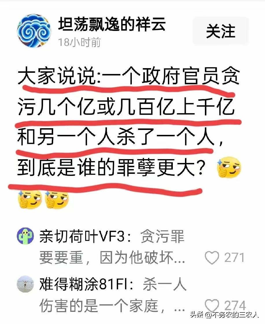 “一个官员贪污上亿,和一个人杀了一个人,到底谁更罪恶?” 这是最近网络上一个被热议的问题。 先看一个现实中的例子:一名公职人员因公殉职,国家给予的抚恤补偿,通常不会超过一百万元。 这个数字很残酷,但它清晰地表明:在现有的社会补偿体系中,一百万,被视为对一条生命的衡量价值。也可以说是一个生命的“官方定价”。 那么我们先看看贪腐意味着什么:它贪走的不是纸面上的数字,而是本应属于全民的道路、学校的砖瓦、医院的设备、 基金的积蓄、救灾的物资,甚至战士枪中的子弹… 每贪一笔钱,就等于抽走他人赖以生存的希望。 当贪污金额达到一百万时,从社会资源剥夺的尺度上看,其造成的生存价值毁灭,已等同于夺走一个人的生命。贪一千万,便是夺走了十个人的“生存基础”;贪一个亿,便是上百个家庭赖以生存的根基被一只无形的手抹去。 这不是冰冷的数字换算,而是触目惊心的现实等价。 那么问题来了:为何我们对直接杀人零容忍,却对贪腐这种“无形之恶”宽容? 因为杀人流血可见,痛苦直接而具体;而贪污的恶果是间接的、分散的、延迟的。它不会立刻让人倒地,而是让一个地区发展停滞,让一群孩子失去好老师,让无数病患用不上好药…这种“慢性的毒杀”,因其隐蔽,反而危害更广、更深。 所以,回到开头那个问题。从直接剥夺生命的角度,杀人犯罪孽深重。但从利用公权,系统性剥夺无数人生存根基与未来的角度,巨贪的罪孽,如同投毒于水源,祸及子孙。 那么可以下结论了:反腐败,就是一场捍卫社会生命线的战争。 对侵蚀国本、动摇根基的巨贪施以极刑,不仅是对法律尊严的捍卫,更是对社会公平和生命价值最根本的敬畏——贪腐不止是窃取钱财,它本质上,是在窃取本属于人民的生活,乃至生命。