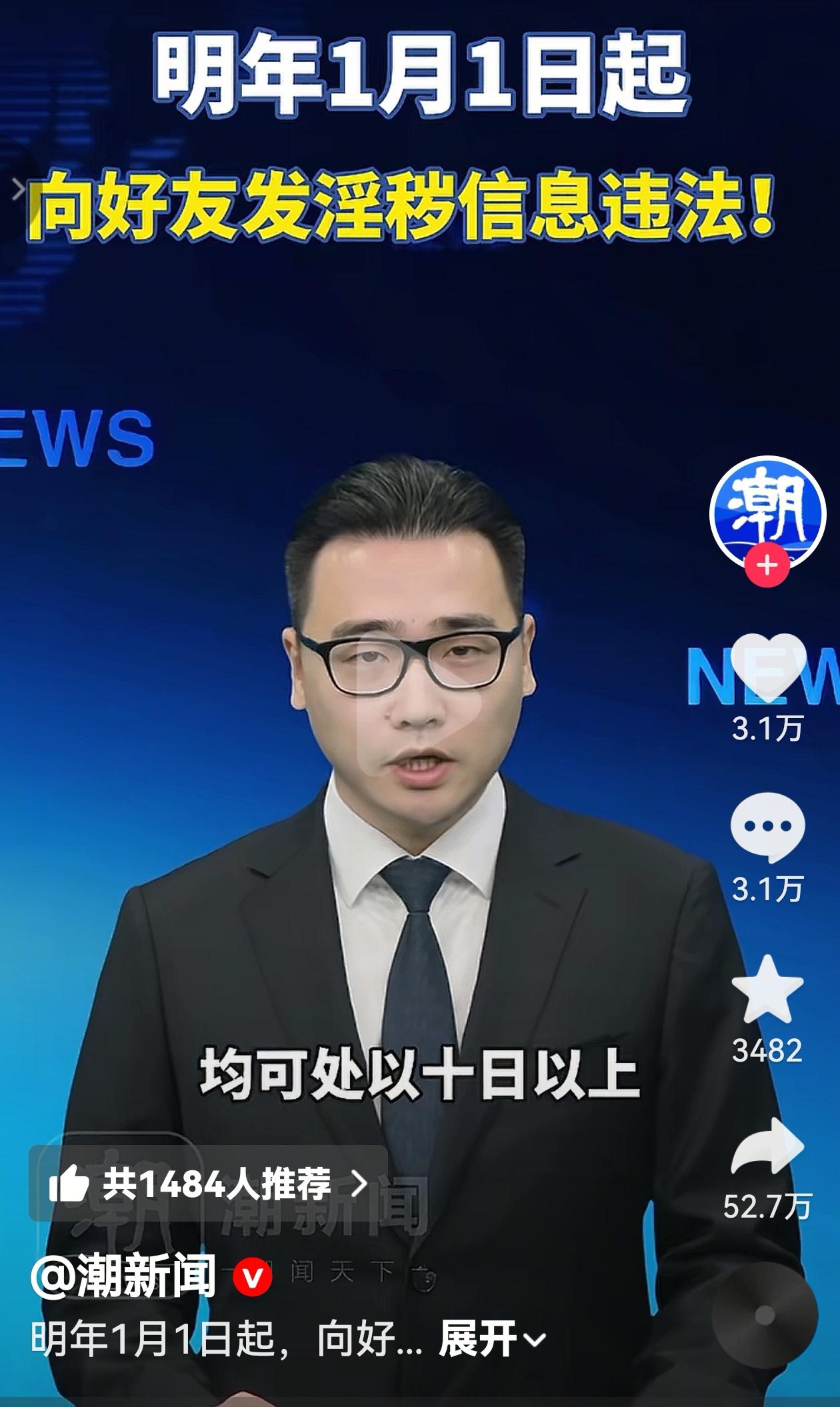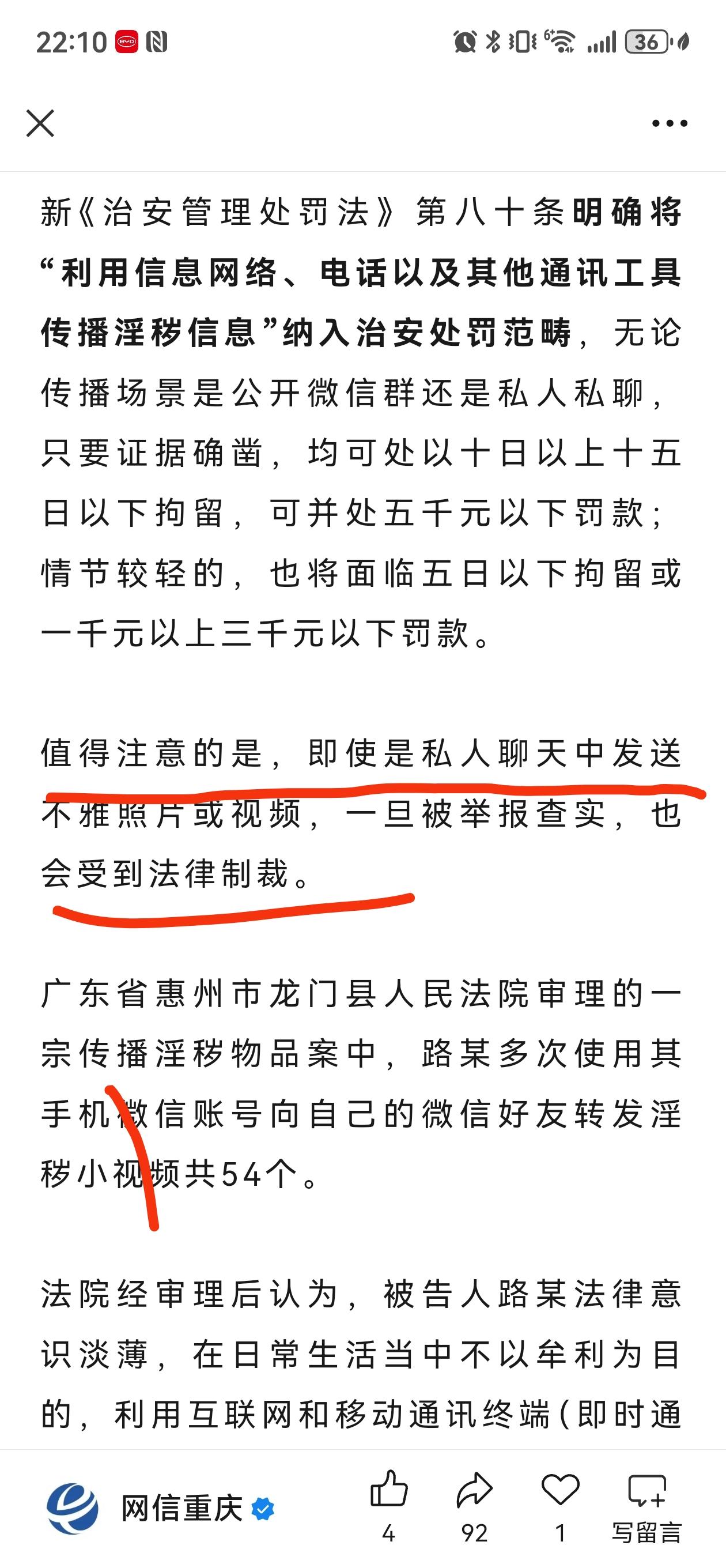 大家注意了,新规实施,以后有人向你求种子求分享,“好人一生平安”的要小心了。 万一交友“不慎”,你可能就要违法了。 2026年1月1日起,新修订的《中华人民共和国治安管理处罚法》(以下简称《治安管理处罚法》)将正式施行,其中第八十条对传播淫秽信息的处罚规定作出明确细化,对传播淫秽信息加大了处罚力度。 因此,就算不是你在群里面发的,也不以盈利为目的。但是一旦你传播的图片或者视频带点颜色了。碰巧又被别人举报了,那么你就涉嫌违法了! [捂脸][捂脸]
