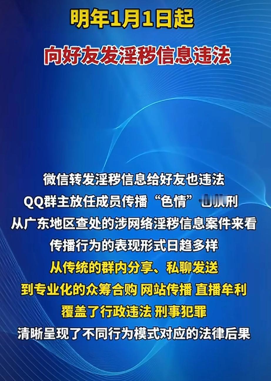 明年起,微信私聊发“小视频”可能进去蹲15天! 这事儿真不是闹着玩的。2026年1月1号,新版《治安管理处罚法》就要正式落地了,最炸的一条就是,以后哪怕在微信上私聊给好友发点不雅照片、小视频,只要被举报查实,最高能拘你15天,罚你5000块。 很多人一听就懵了,觉得“我跟我对象、哥们儿私下传着玩,碍着谁了?” 这误会可就大了。其实啊,法律早就管这事儿了,不是新发明。这次新规主要是把罚款上限从3000提到了5000,罚得更狠了,而且特别强调,要是涉及未成年人,一律从重处罚。 说白了,就是给法律紧一紧螺丝,告诉大家网络真不是法外之地。 可大家吵翻天的点在哪呢?首先是“亲密关系豁免”成了糊涂账。夫妻、情侣之间互发点私密的,算不算违法?法律没明说。 这就埋了雷,万一哪天闹掰了,对方拿着聊天记录去举报,你说冤不冤?法律界的朋友也说了,这得看主观意图和内容性质,但普通人哪分得清。 再有就是,“淫秽信息”这词儿太模糊了。那些搞怪的表情包、抽象的“梗图”,算不算?催婚催生的段子,算不算?现在都没个准谱儿,全看怎么解释,大家心里能不慌吗? 更让人后背发凉的是,已经有真人真事栽进去了。广东惠州有个路某,就是图个乐,给好友微信上转了54部小视频,结果被判了传播淫秽物品罪。 清远还有个李某,给7个人发了104部,也进去了。这可不是行政处罚,是刑事犯罪,要留案底的。还有更冤的?当群主!广东一个QQ群的三个管理员,就因为没管住群里447个成员,让人上传了221部视频,最后全获刑了,十个月到一年不等。这管理费,收得可真贵。 所以啊,新规一出来,各种担心都冒出来了:平台会不会监控私聊?警察是不是随时能查我手机?官方和律师都出来灭火了,说前提是“举报查实”,公安机关不主动监控私聊。但这话听着,还是让人心里不踏实。 说到底,这条法律的靶心,瞄的是那些规模化传播的链条,特别是祸害未成年人的黑手。对于咱们普通人,偶尔手滑、朋友间玩笑,只要别过火、别涉及孩子,实际被揪出来的案例并不多。 但这条红线算是画得明明白白了。以后聊天,真得收着点了,那些拿不准的“好东西”,就别急着分享了。网络清朗,人人有责,这话听着像口号,但如今,它真的开始管到你的私聊窗口里了。
