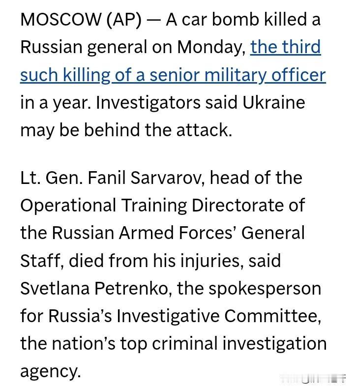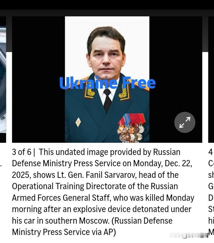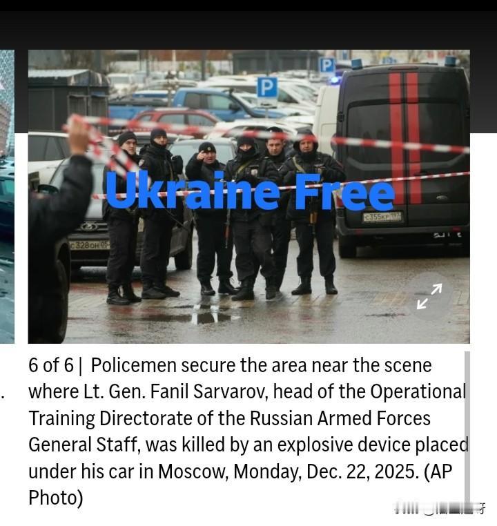 周一,莫斯科,俄罗斯武装部队总参谋部作战训练局局长法尼尔.萨尔瓦罗夫中将被炸死在汽车里,据说他的车底下被安置了一枚爆炸装置。[吃瓜群众] Merry Christmas[烟花] 乌克兰 聚焦俄罗斯乌克兰局势 俄罗斯乌克兰最新局势 俄乌战争