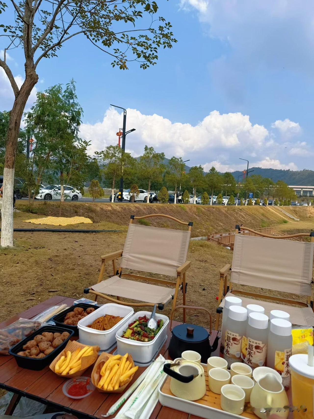 今天的天气也太舒服了!蓝天白云的,跟姐妹约着出来野餐简直太爽啦~找了块开阔的草地,支上小桌子摆上满满一桌好吃的,薯条、小炸物还有凉拌菜,再配上茶具泡点茶,旁边还摆着饮料,看着就幸福感爆棚。吹着小风,跟姐妹唠唠嗑,晒着太阳一点都不冷,远处还有山和树,随手拍都好看。啥烦心事都抛脑后了,就这么慢悠悠待着,这才是一天该有的样子嘛!