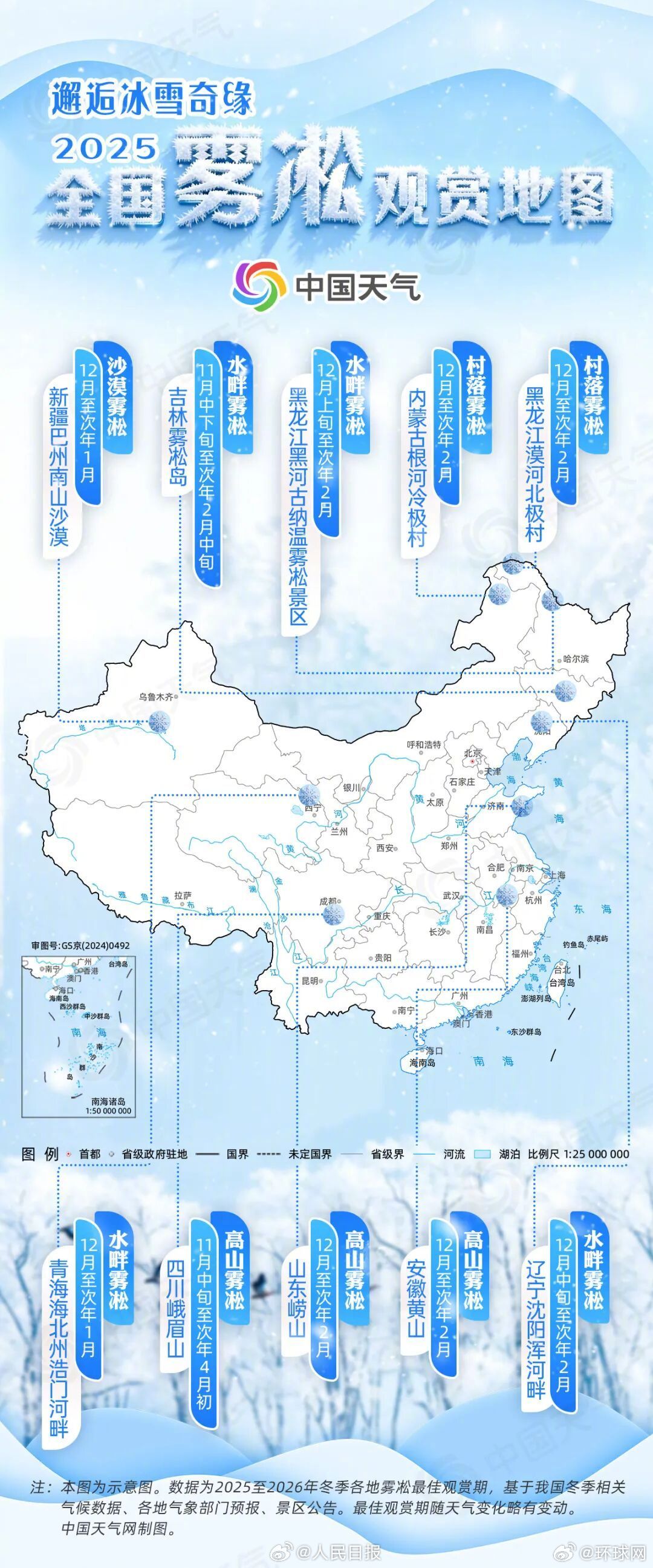 【#今冬全国赏雾凇地图#来了】#沙漠里的雾凇是什么景象# 数九寒天已经到来,多地相继进入雾凇观赏的最佳时期。❄️最佳观赏期:大多集中在12月至次年2月❄️分布地:北方:新疆、青海、内蒙古、黑龙江等地南方:藏于云雾缭绕的高山之巅,如安徽黄山、四川峨眉山等地❄️除了水畔、村落、高山,沙漠也能邂逅雾凇景观❄️雾凇常伴随雪、雾出现,注意保暖措施(中国天气)网页链接