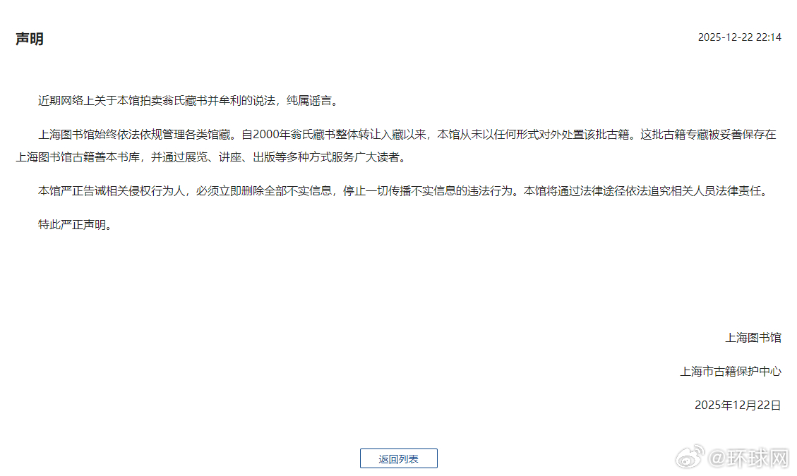 #上海图书馆严正声明#【上海图书馆:关于本馆拍卖翁氏藏书并牟利的说法纯属谣言】 #上海图书馆辟谣拍卖翁氏藏书并牟利说法#