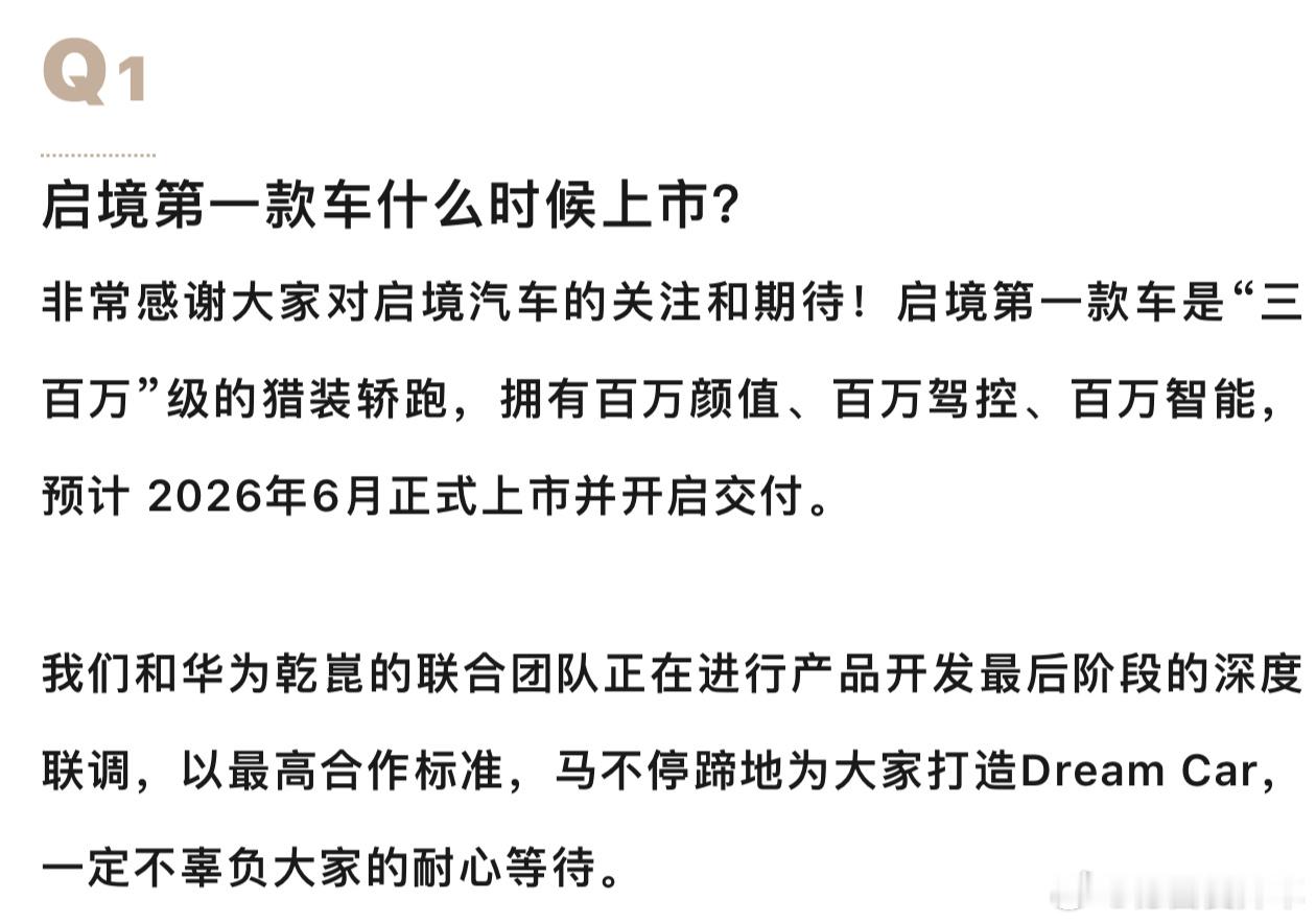 今天奕境和启境都做了宣发,东风奕境是全尺寸SUV车型,将在明年北京车展正式亮相;广汽启境则是猎装轿跑车型,产品的上市节点是明年6月。华为乾崑奕境启境