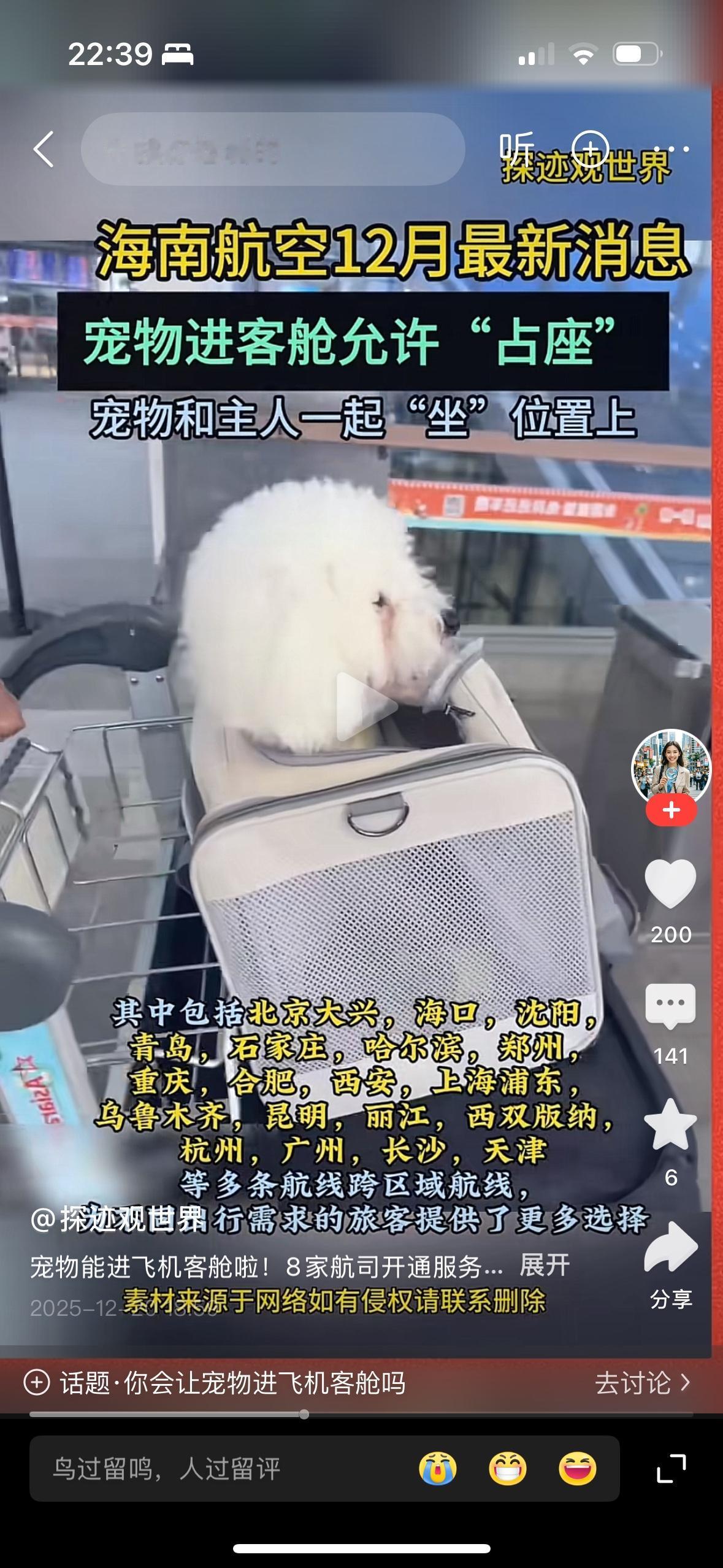 建议全民抵制海南航空,不要买海南航空的机票,海南航空居然出的一条规定,十二月份起允许宠物坐飞机与乘客同座位,如果确实有这种规定,我再也不会做海南航空的飞机了
