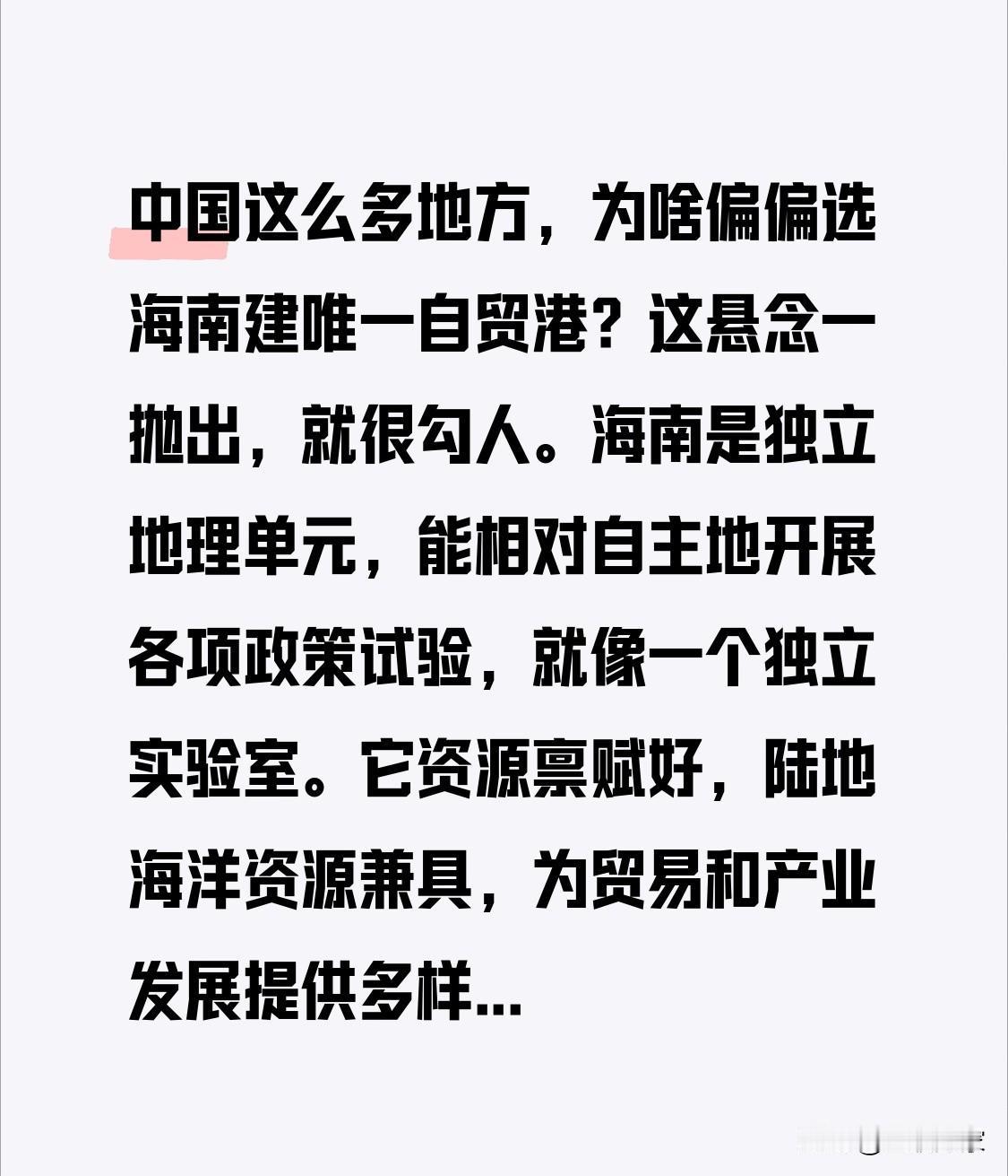 中国这么多地方,为啥偏偏选海南建唯一自贸港?这悬念一抛出,就很勾人。海南是独立地理单元,能相对自主地开展各项政策试验,就像一个独立实验室。它资源禀赋好,陆地海洋资源兼具,为贸易和产业发展提供多样可能。而且地理位置优越,背靠华南,面向东南亚大市场,就像站在国际贸易的十字路口。 海南建自贸港,不仅是自身发展机遇,也对国家开放意义重大。大家怎么看海南自贸港的未来?它会给我们生活带来啥改变?海南又该如何发挥优势呢? 海南自贸政策 海南自贸政策 海南自由贸易区 海南自贸港好处 海南自贸港政策 海南跨境自贸港 海南自由港新规 海南免税港