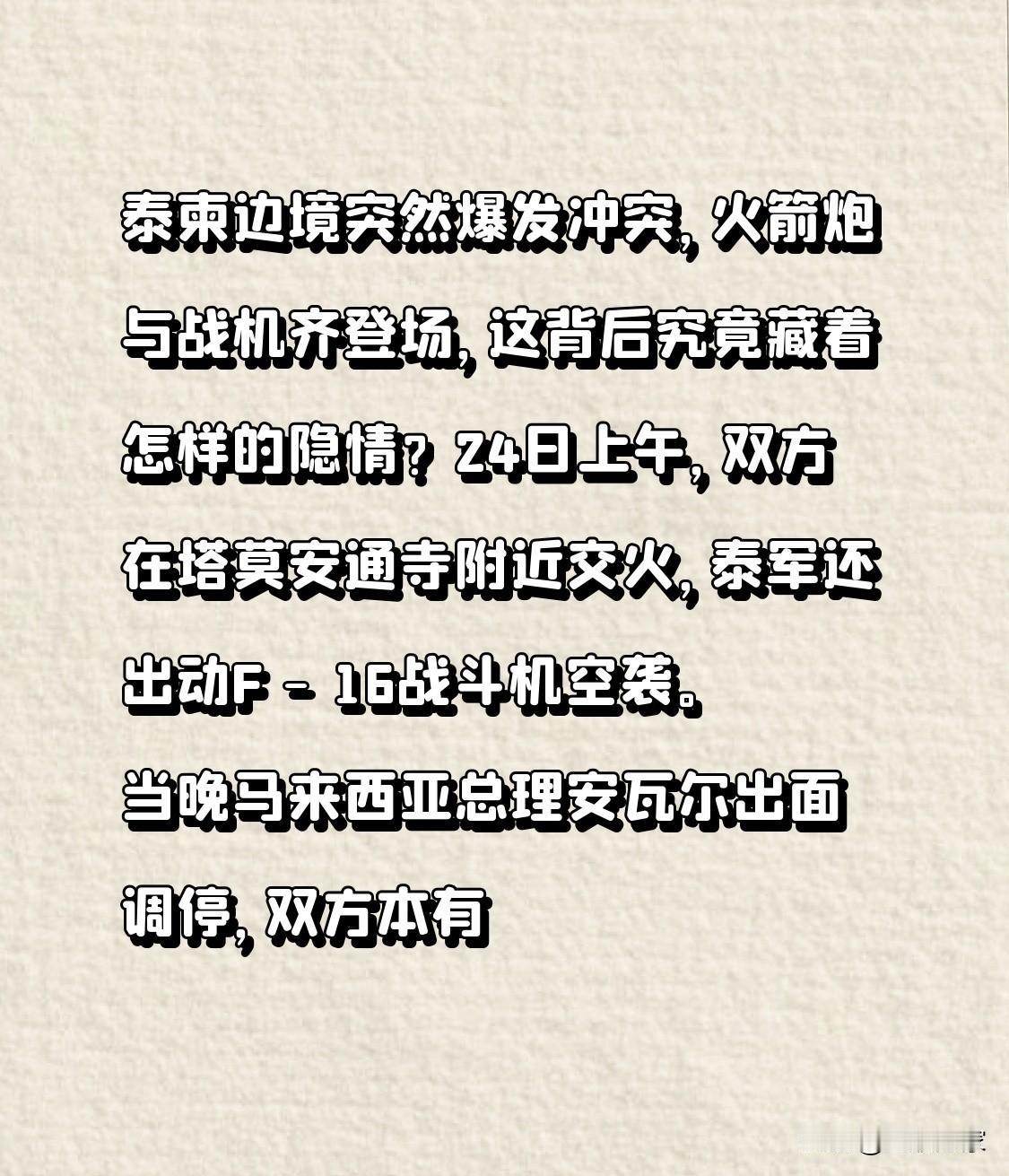 泰柬边境突然爆发冲突,火箭炮与战机齐登场,这背后究竟藏着怎样的隐情?24日上午,双方在塔莫安通寺附近交火,泰军还出动F - 16战斗机空袭。当晚马来西亚总理安瓦尔出面调停,双方本有望停火,可一个多小时后泰方却突然变卦,这是为何?柬方指责泰方言而无信,泰方称是为维护主权。这场冲突让和平的希望变得渺茫。 大家觉得泰柬边境冲突最终会走向何方?第三方的调停还有用吗?又该如何才能真正解决这场争端呢? 泰柬冲突 泰柬边境局势 泰柬争端 柬泰军事冲突 泰柬边境争端 泰柬局势 泰柬军事冲突 泰柬边境冲突 泰柬边境局势 柬泰军事冲突 泰柬边境争端 泰柬局势 泰柬军事冲突 泰柬交火
