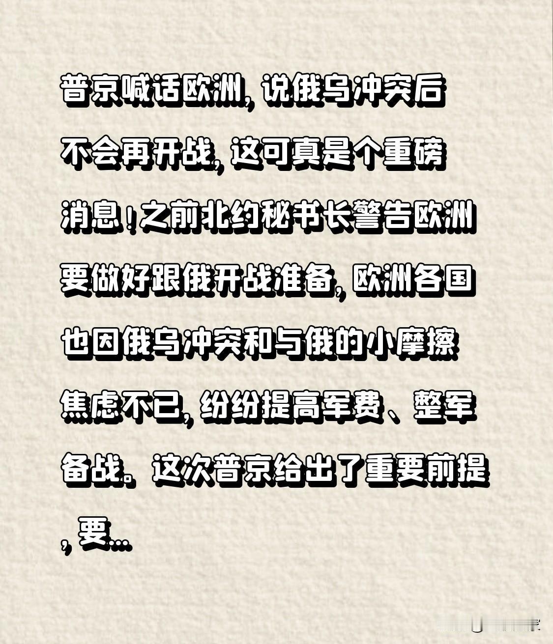 普京喊话欧洲,说俄乌冲突后不会再开战,这可真是个重磅消息!之前北约秘书长警告欧洲要做好跟俄开战准备,欧洲各国也因俄乌冲突和与俄的小摩擦焦虑不已,纷纷提高军费、整军备战。 这次普京给出了重要前提,要是西方尊重俄罗斯利益,不搞北约东扩那套欺骗的把戏,就不会有新行动。这其实是在安抚欧洲。不过,西方和俄罗斯之间的矛盾由来已久,北约东扩问题更是根深蒂固。 这喊话能让欧洲吃下“定心丸”吗?俄罗斯和欧洲未来关系会走向何方?北约又会如何应对普京的表态?大家怎么看呢? 俄乌冲突 俄乌战争 俄乌局势 乌俄和谈 乌俄冲突 俄乌大战的启示 俄乌冲突 俄乌战争 俄乌局势 乌俄和谈 乌俄冲突 俄乌大战的启示 乌俄关系