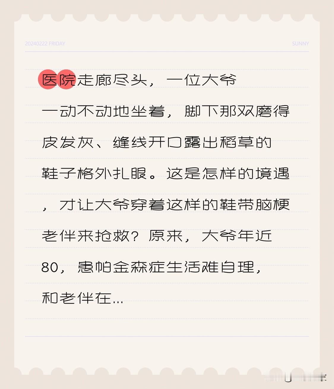 医院走廊尽头,一位大爷一动不动地坐着,脚下那双磨得皮发灰、缝线开口露出稻草的鞋子格外扎眼。这是怎样的境遇,才让大爷穿着这样的鞋带脑梗老伴来抢救? 原来,大爷年近80,患帕金森症生活难自理,和老伴在农村相依为命。老伴中风,他心急如焚,顾不上自己的病,坐公交送老伴来医院。可老伴病情复杂,治疗费用高昂,大爷卡里只有卖谷子和低保的钱,根本不够。最终,只能放弃治疗。 这一幕让人感叹生活的无奈。大家身边有没有类似让人揪心的故事?面对这样的困境,又该如何是好?你觉得社会能为这些老人做些什么呢? 摔倒老人 偏瘫 摔倒老人 偏瘫 脑中风偏瘫 大爷住院 大爷脑梗塞 卒中病人 偏瘫手抖