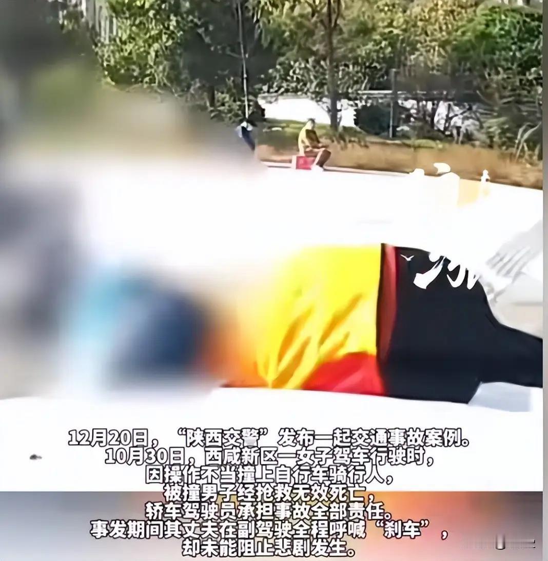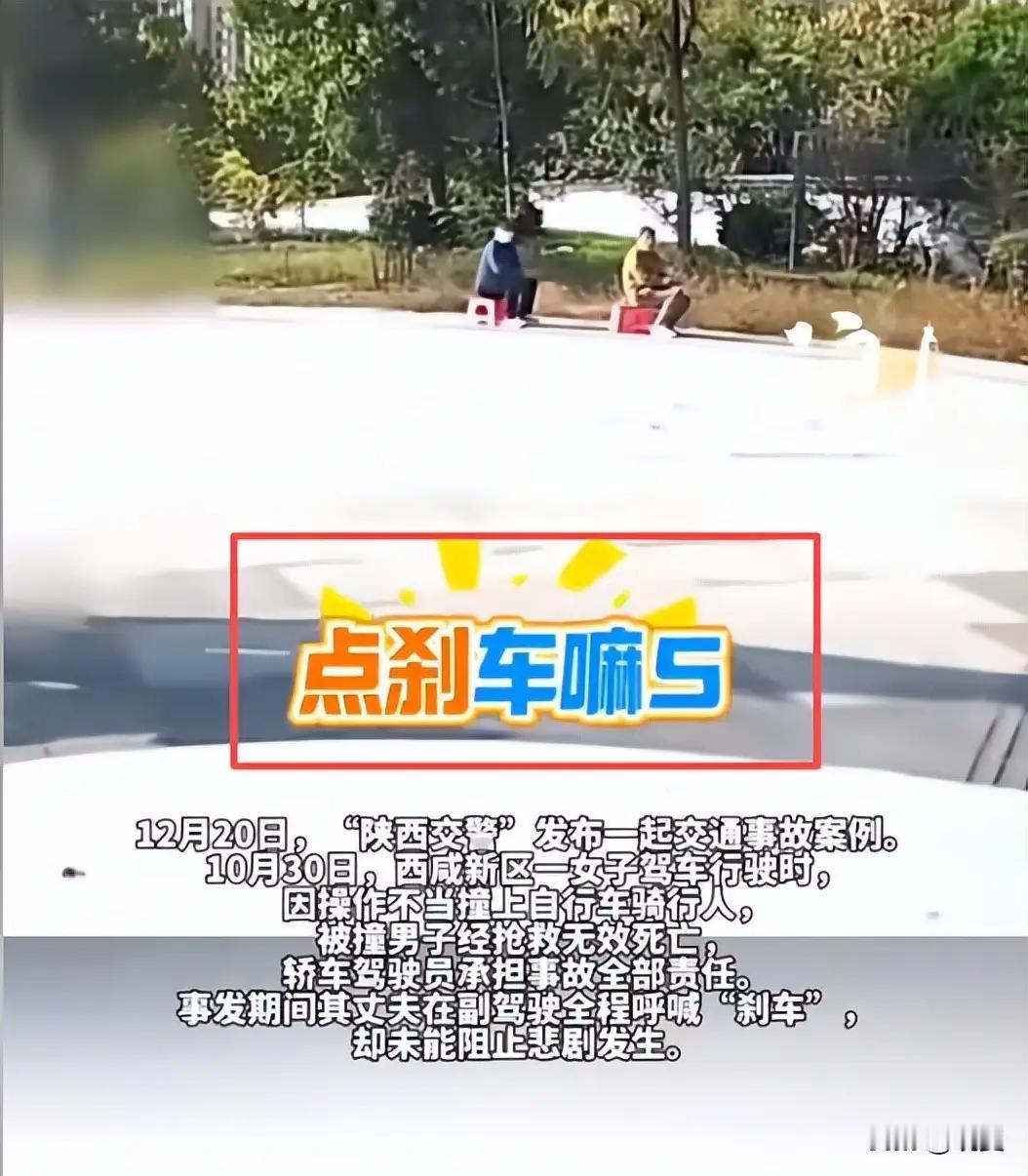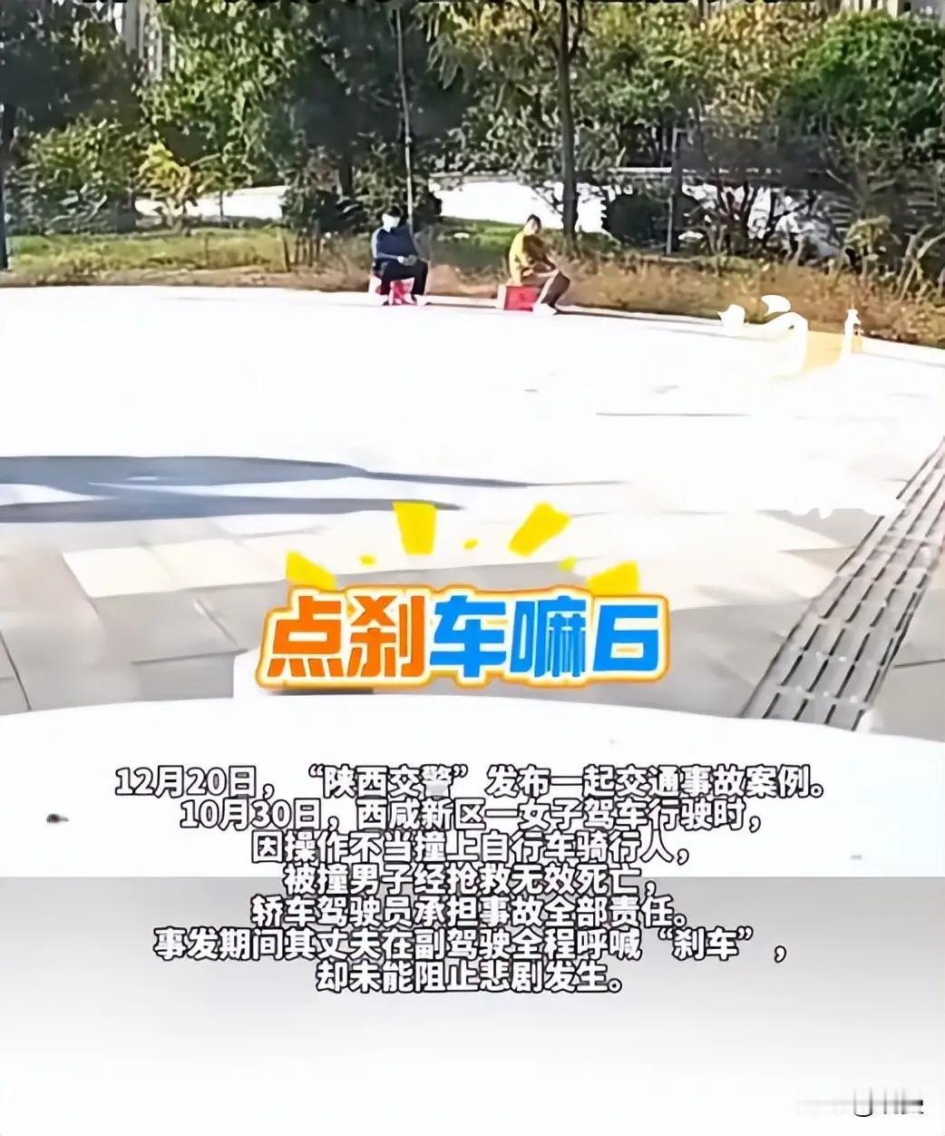 赤裸裸的谋杀? 悲惨的故事,傻傻的妻子着急的丈夫。 妻子驾驶车辆,丈夫旁边连喊六次刹车,最终妻子还是撞上了骑自行车的人。而被撞者已经去世。画面曝光后也是引起了网友的吐槽。 不是这妻子为何不听劝呢?还是说在这种紧急的情况下,妻子已经是慌了神,看到视频中行驶的车辆,看得出这速度很慢啊,并没有很快。 眼瞅着前面有一位骑着自行车的路人,车子马上就要撞上去了,丈夫更是比旁边急的不行,然而妻子似乎已经是慌了神。即便是车子撞到了自行车的驾驶人,但依旧是没有停下。直到车子从身上碾压过去。 这骑自行车的是一位年轻人,自己怎么也想不到会遇上这种司机,即便是车速缓慢,仍然是要了他的生命,油门和刹车都分不清,这众人驾照是怎么考的?如果是练习车子,也要找一条车少路少的道路进行啊。拿别人的生命当玩笑了?