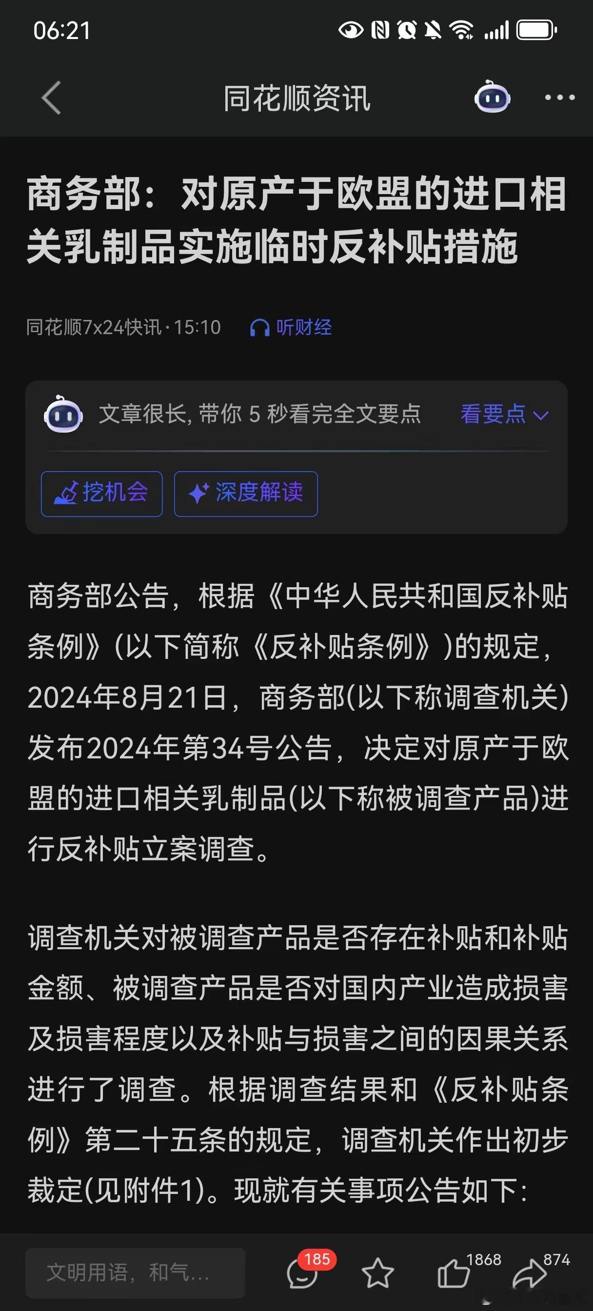 今天消费板块乳制品又迎来了重磅利好!我们对欧盟进行了反补贴措施!那这就对我们的乳制品是重磅利好,怪不得下午安记和东百强势拉涨停,今天整个a股可以说是群魔乱舞,近期强势的板块全部拉了一遍!但是,就只有海南板块的涨幅最大,但是高度却在消费和商业航天这两个板块上面!今天下午这个利好我相信明天会让市场做出选择,大概率是消费板块一枝独秀,领跑全场,如果这个消息都不能让消费明天确立主线的话,那后面这个方向就不用再关注了!从安记日线的走势来看,明摆着就是想启动第二波行情,所以,明天只要高开高走,11点前出现涨停就能够上车,否则,他就一定会走弱,从而带动整个消费板块走弱!大家看好消费板块能跨年吗?