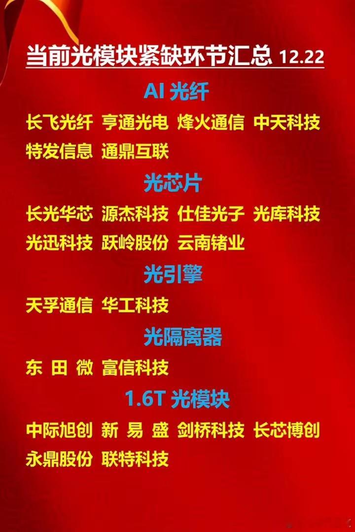 当前光模块紧缺环节汇总12.22。·AI光纤:长飞光纤、亨通光电、烽火通信、中天科技、特发信息、通鼎互联。·光芯片:长光华芯、源杰科技、仕佳光子、光库科技、光迅科技、跃岭股份、云南锗业。·光引擎:天孚通信、华工科技。·光隔离器:东田微富信科技。·1.6T光模块:中际旭创新、易盛剑桥科技、长芯博创、永鼎股份、联特科技。