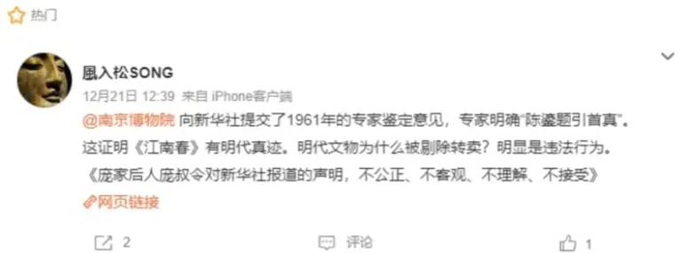 庞家后人一句!不公正,不理解,不接受!直接把南京博物院推上了舆论的风口浪尖!这幅明代仇英的《江南春》图卷,从1959年庞家无偿捐赠给南博,到2025年突然现身拍卖市场估价8800万,再到南博称其是赝品且早已被处置,剧情跌宕起伏堪比电视剧。 关键矛盾点在于庞家质疑南博在数十年间从未就文物的鉴定和处置情况与他们沟通,剥夺了捐赠人的知情权。而南博出示的1961年和1964年专家鉴定记录均指出该作为伪作,并称上世纪90年代依照当时的《博物馆藏品管理办法》进行了处置。值得注意的是,新华社报道提及的一些关键文件,据庞家表示是他们在法庭上寻求但未获得的。 网友们几乎一边倒支持庞家。有人吐槽南博这波操作,谁还敢捐文物?也有人质疑当年6800元卖的伪作,现在估值8800万,这翻了一万多倍怎么解释?更有眼尖的网友发现,1997年的处置文件上有相关签名,但与某些回应存在矛盾之处,这让公众对流程的合规性产生疑问。 目前,江苏省文旅厅已表示牵头成立工作专班联合调查处理此事。这场风波早已超越了一幅画的真伪之争,触及的是文博机构公信力和对捐赠人尊重与透明的核心问题。大家普遍期待一个彻底公开,透明的调查结果,这不仅是给庞家一个交代,更是重建文化捐赠信任的关键一步。
