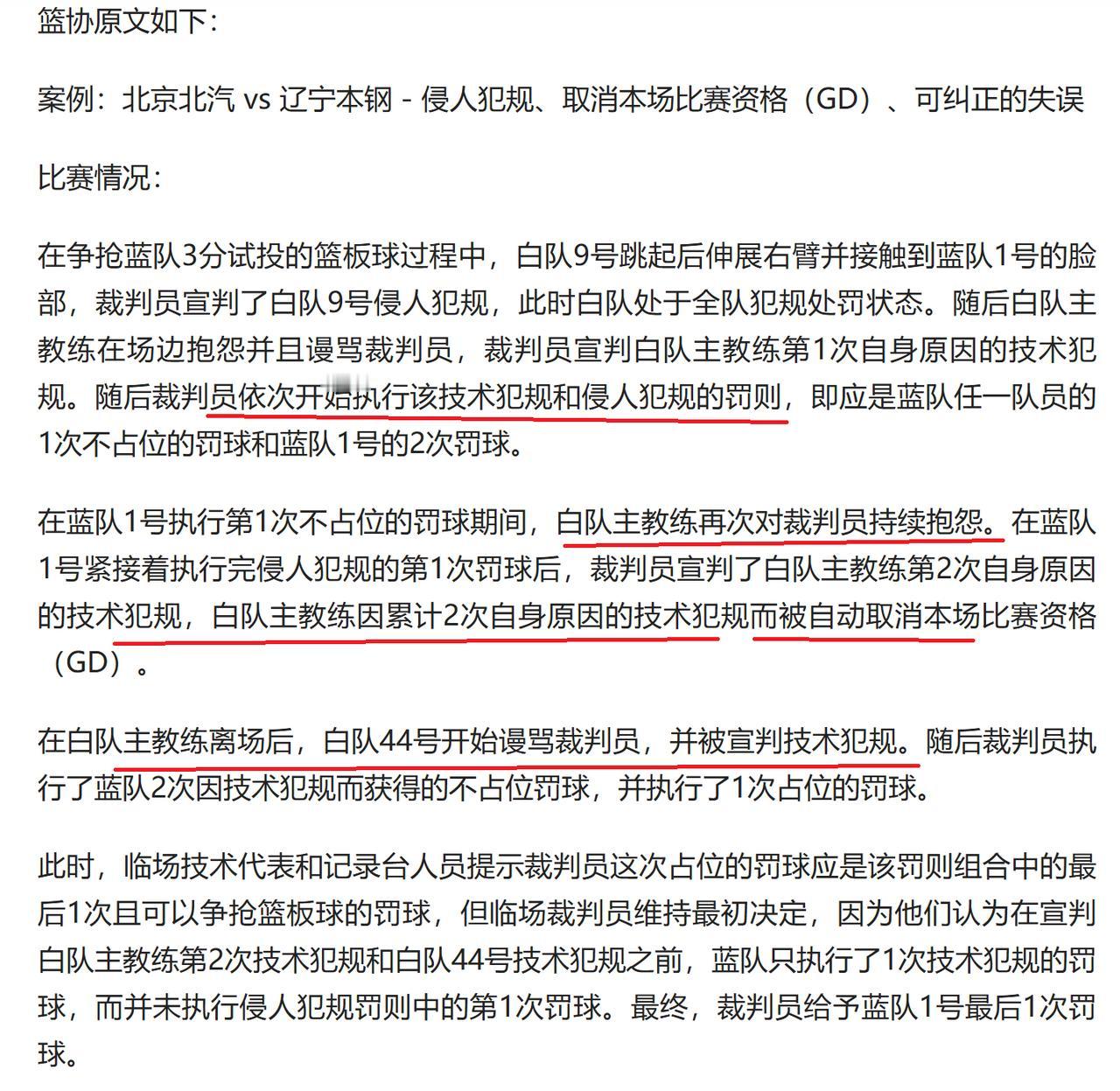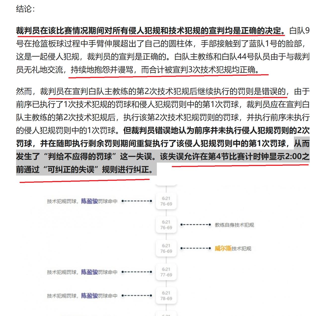CBA裁判报告:裁判吹罚杨鸣2次技术犯规正确,错误将5次罚球执行了6次罚球,最后2分钟可以进行纠正。 CBA常规赛,辽宁队与北京队的比赛,发生了一件争议非常大的事件,没错,那就是杨鸣因为不满意裁判的吹罚,不断质疑和抱怨当值裁判,裁判给他杨鸣一个技术犯规。随后杨鸣依然是喋喋不休,不断抱怨裁判,结果,裁判再吹了杨鸣一个技术犯规,就这样,杨鸣因为两次技术犯规,被驱逐出场。 随后,辽宁队外援威尔斯,也因为抱怨裁判被吹了一个技术犯规。在这样的情况下,北京队应该获得5次罚球,分别姜宇星犯规2次罚球+杨鸣两次技术犯规2次罚球+威尔斯技术犯规1次罚球。 但是,当值裁判因为没有搞清楚陈盈骏罚篮次数,让他一共是罚了6次篮。就这样,导致原本5次罚球,变成了6次罚球。 针对上述情况,中国篮协也是进行了复盘,最终,认定姜宇星犯规没有问题,杨鸣因为不满意裁判吹罚,不断抱怨裁判,被连续吹了2次技术犯规,也是没有问题。当杨鸣离场之后,威尔斯不断抱怨裁判,裁判给了他一个技术犯规,也是没有问题。 最后的问题就是出现在罚球次数上, 陈盈骏本应该是罚篮5次,结果,他却罚了6次篮。这其中多一次罚球存在错误。 就这样,“判给不应得的罚球”这一次失误。不过,该失误其实还有办法补救,那就是在第4节比赛计时钟显示2:00之前,可以通过“可纠正的失误”规则进行纠正。 然而,由于当值裁判员,以及现场技术台工作人员,似乎也是没有认识到这个错误。所以,导致这一次失误也是不了了之。 相信球迷通过篮协这次报告,也是了解了相关的规则,明白了对错吧。当值裁判的吹罚没有问题,错在了最后罚球次数上,把五次罚球变成了六次罚球。 其实,国内知名解说员苏群,在此前,也是谈到了此事,他认为不管怎么样,本应罚5次球,后来罚了6次,就是不对!那么,各位看官,您对此事有什么看法呢?
