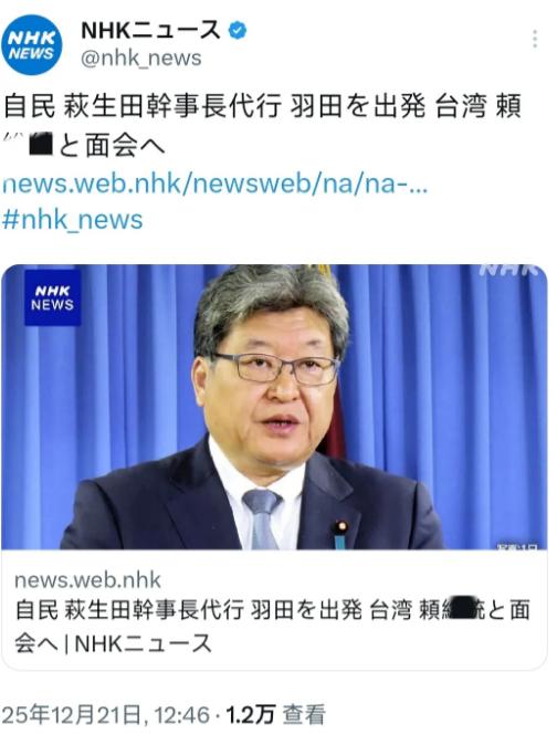 据日本NHK报道:12月21日,自民党代理干事长萩生田光一从羽田机场出发前往台湾与赖清德会面。 自民党代理干事长萩生田光一这趟赴台见赖清德的行程,明眼人一看就知道不简单。 刚过去没多久,日本首相高市早苗才在台湾问题上抛出过挑衅言论,公然把“台湾有事”和日本的“存亡危机事态”绑在一起,暗示要武力介入,那会儿咱们已经给出了反击,可看这架势,日本方面压根没把咱们的反击放在眼里,反而还在往对抗的路上猛踩油门。 萩生田光一可不是什么普通的日本政客,作为自民党的代理干事长,在执政党里仅次于党首高市早苗,说是二号人物一点不为过。 这种级别的官员公开从羽田机场出发,直奔台湾去见赖清德,本身就带着强烈的信号,等于把日方的对抗姿态摆到了明面上。 这已经不是私下里的小动作,而是执政党层面的公然表态,足以说明他们不仅没有半点悔意,反而在刻意升级对华的挑衅力度。 更值得说道的是,萩生田光一本身就不是什么温和派,早就因为各种右翼言论出过圈。之前他就公然宣称日本不存在所谓“战犯”,还多次给供奉着二战甲级战犯的靖国神社献祭品。 现在高市早苗政府本来就在一条劲地搞激进安保政策,又是要修改安保三文件、放宽武器出口限制,又是要大幅提高防卫费,一门心思往军事化国家的方向靠,萩生田作为她手下的核心干将,这次赴台行动,很难说不是双方默契之下的又一次有预谋的挑衅。 要知道,高市早苗之前那番涉台谬论已经在日本国内引发了不小的争议,不少日本前首相和政界人士都站出来反对,说她的言论不合逻辑,会加剧日中紧张关系。 可即便如此,高市政府不仅没有收敛,反而让萩生田紧接着搞出这一出,这背后的心思其实很清楚,就是想借着台湾问题继续炒作“外部威胁”,为他们国内推进扩军、修改安保文件找借口。 毕竟高市早苗一上台就把军事安保当成主打牌,又是要搞先发制人攻击能力,又是要研究建造核潜艇,这些激进政策需要一个“合理”的由头来忽悠国内民众。 而另一边,赖清德也不是什么善茬,上台之后就一直拿着“抗陆”当噱头,抛出所谓的“17项策略”,直接把大陆当成“境外敌对势力”,搞得两岸关系紧绷不已。 之前高市早苗发表涉台挑衅言论的时候,他还跟着附和,说大陆是“麻烦制造者”,结果被岛内民众骂媚日丢了民族尊严。 这次借着萩生田赴台的机会会面,本质上就是“台独”势力和外部干涉势力的又一次勾结,两边各取所需,一个想借外部势力壮胆,一个想借“台独”势力搅乱台海,好从中渔利。 萩生田光一这趟行程,也暴露了日本自民党内部现在的混乱和激进。毕竟他本人还卷在黑金丑闻里没完全脱身,之前就因为涉案金额不小受到过党内处分,连自民党的执政盟友公明党都因为这事跟他们闹掰了,退出了执政联盟。 在这种国内政局不稳的情况下,他们不忙着解决内部问题,反而转头在台湾问题上挑事,说白了就是想转移国内民众的注意力,用对外的强硬姿态掩盖内部的困境。 可他们显然打错了算盘,台湾是中国不可分割的一部分,这是国际社会公认的事实,也是不容任何挑战的底线。高市早苗的挑衅已经让中日关系变得紧张,现在萩生田又变本加厉地赴台会面,只会进一步破坏中日关系的基础。 这种拿他国主权当筹码,为自己政治私利服务的做法,不仅会遭到中国人民的坚决反对,也会让国际社会看清他们搞分裂、挑对抗的真实面目。 日本方面大概是觉得靠着这种挑衅能占到什么便宜,却忘了中国维护国家主权和领土完整的决心从来都不是说说而已。 之前的反击只是开始,要是他们继续沿着这条错误的路走下去,只会让自己陷入更被动的境地。毕竟搞对抗从来都没有好下场,尤其是在涉及中国核心利益的问题上,任何试探和挑衅,最终只会自食恶果。 萩生田光一和赖清德的这次会面,说白了就是一场注定不会有好结果的闹剧。一边是急于转移国内矛盾的日本激进政客,一边是想靠外部势力续命的“台独”分子,两者勾结在一起,除了加剧地区紧张局势,不会带来任何积极影响。 而这背后,更能看出日本自民党现在为了维持统治,已经不惜牺牲中日关系的大局,不惜破坏地区的和平稳定,这种短视的做法,最终只会让日本付出沉重的代价。 不管是高市早苗的公然挑衅,还是萩生田的赴台会面,都改变不了台湾是中国领土一部分的事实,也动摇不了中国捍卫国家主权的决心。 日本方面要是还有点理智,就该赶紧收敛自己的行为,停止在台湾问题上玩火,否则等到局面无法收拾的时候,再想回头就晚了。 毕竟在主权问题上,中国从来都不会退让,任何外部势力的干涉,最终都只会被碰得头破血流。