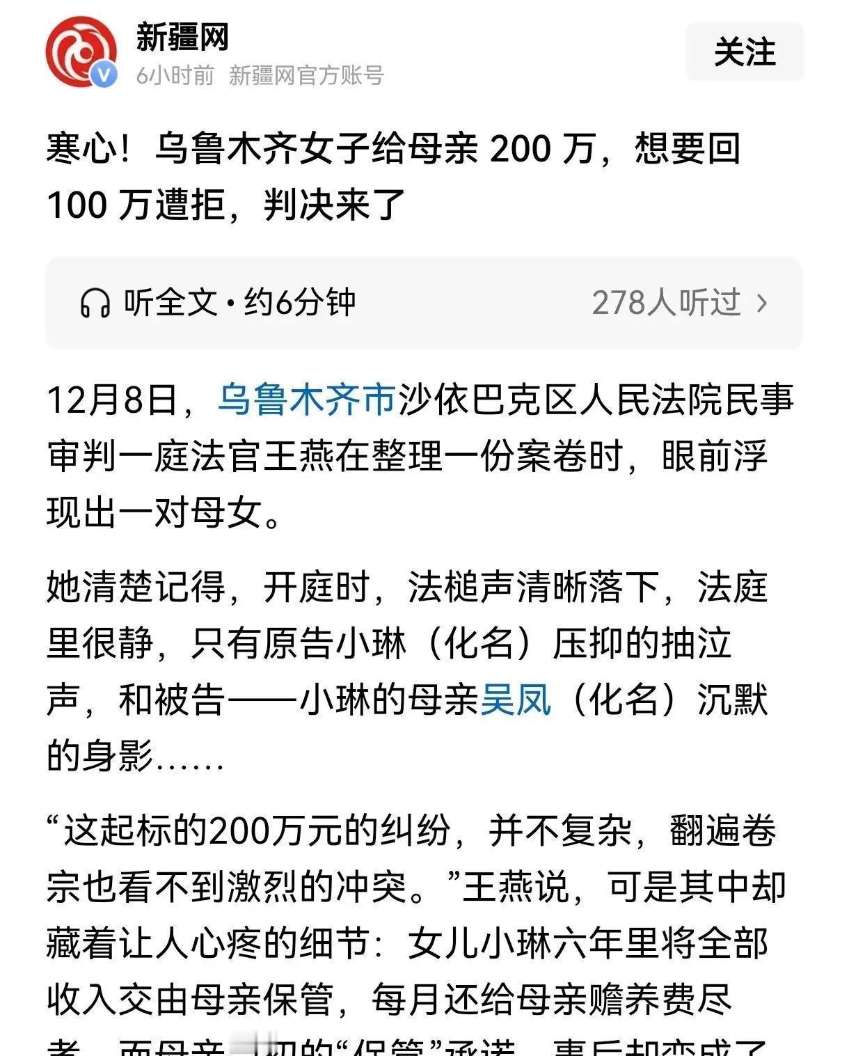 心寒!新疆乌鲁木齐,母亲以帮女儿存钱为由,让女儿6年里陆陆续续给她打了200多万,6年后,女儿想要拿这笔钱去进修,母亲却反翻脸,一口咬定是女儿主动给她的赡养费,女儿被母亲的一番操作吓傻了,但是看在母女情分上,女儿心软提出只要100万,剩下的100万给母亲做为赡养费,以后每个月再给她4000元生活费,没想到目前竟然直接回绝,要钱一分没有,这都是自己该得的,无奈之下,女儿含泪将母亲告上法庭,法院最后这样判了! 小林是在单亲家庭里长大的,从小就把母亲当成唯一的依靠。记忆里,母亲为了拉扯她长大,吃了不少苦,在菜市场捡菜叶、省吃俭用喝酱油稀饭的样子,一直刻在她心里。所以成年后,小林凭着高挑的身材闯进了模特圈,哪怕这行看着光鲜,背后全是起早贪黑赶通告的辛苦,她也毫无怨言。 对她来说,拼命赚钱的动力就是让母亲过上好日子,所以每次发了薪水,她做的第一件事就是把钱转到母亲账户里,六年下来,一点一滴攒着,总共转了200万元。 母亲每次收到钱,都会温柔地跟她说,这些钱会替她妥善保管,防止她被人骗,还会把存着钱的存折照片发给她,用红笔圈出余额,让她放心。 那些聊天记录里的承诺,还有存折上的数字,比任何保证都让小林安心。她一直以为,母亲是她最坚实的后盾,这笔钱放在母亲那里,就像放进了最安全的保险柜。 可这份信任,在2025年被彻底打碎了。 这一年,模特圈新人辈出,比小林年轻、条件好的新人越来越多,她感受到了前所未有的职业危机,整夜整夜地失眠。思前想后,她决定用这笔积蓄去专业院校进修,为自己的后半生谋个转型的出路。 当她满心期待地回家,跟母亲商量取钱的事时,却遭到了意想不到的拒绝。 原本温柔的母亲,一听到“取钱”两个字,瞬间变了脸。她不仅一口回绝了小林的要求,还抛出了一套让小林脊背发凉的说法:“什么你的钱?这都是你主动给我的赡养费。我辛辛苦苦把你养这么大,你给我钱天经地义,想拿回去,门都没有!” 六年的“保管”突然变成了“赡养费”,小林整个人都懵了。 她清楚地知道,母亲才五十出头,身体硬朗得很,平时拿着她的钱买包、做美容、健身,日子过得十分滋润,根本没到需要巨额赡养费来养老的地步。曾经那些“帮你存着”的温情承诺,此刻在她看来,竟像是一场精心编织的骗局。 可毕竟是血浓于水的母女,哪怕心里被伤得厉害,小林还是想保全这份亲情。她红着眼眶,向母亲提出了一个近乎卑微的妥协方案:这200万她不全要了,只拿回100万用来交学费和维持进修期间的生活,剩下的100万直接赠与母亲养老。 她还承诺,以后每个月都会固定给母亲4000元生活费,这个金额在乌鲁木齐,足够母亲衣食无忧地生活了。 让小林没料到的是,她的退让并没有换来母亲的体谅,贪婪早已吞噬了最后的亲情。母亲不仅断然拒绝了这个方案,还放出了狠话:一分钱都不会给,如果小林敢继续争抢,她就去小林的公司闹,去朋友圈里骂她,让她身败名裂。 这句恶毒的威胁,像一根针,彻底扎破了小林对“家”最后的幻想。那些年母女俩一起吃苦喝粥的温情,终究抵不过账户上冰冷的数字。 被逼到绝路的小林,再也忍不住,含着泪将亲生母亲告上了法庭。法庭上,母亲死死攥着“赡养费”的说法不放,而小林拿出的一条条聊天记录和转账备注,成了最有力的证据。 那些“帮你保管”“以后还你”的文字记录,清晰地证明了这笔钱的性质是保管,而非赠与。 根据《民法典》里关于保管合同的规定,只要双方有保管的意思表示,这笔钱就属于保管物,而不是赠与物。法官看得明明白白,母亲虽然有养育之恩,但这并不意味着可以强行占有女儿的储蓄。 尤其是母亲身体健康、具备劳动能力,且小林明确说明了资金用途的情况下,“赡养费”的说法根本站不住脚。 最终,法院做出了大快人心的判决。考虑到小林之前明确表示愿意赠与一部分钱给母亲,法院判决母亲返还100万元给小林,剩余的100万元则按照小林的意愿,确认为赠与。 官司打赢了,100万元也拿回来了,可小林心里的那个家,却彻底塌了。那张判决书虽然守住了她的财产权益,却也白纸黑字地宣告了这段母女关系的破裂。