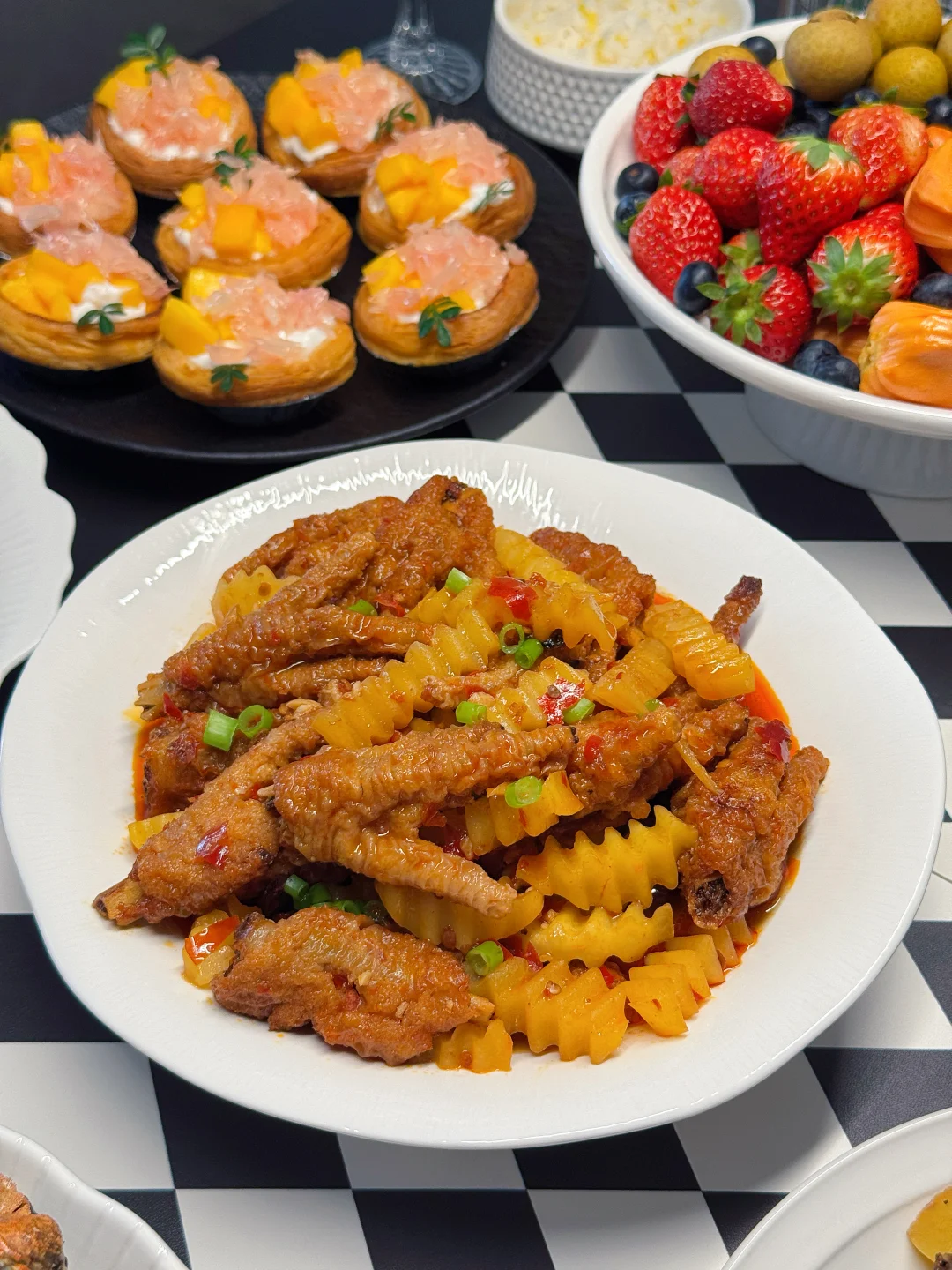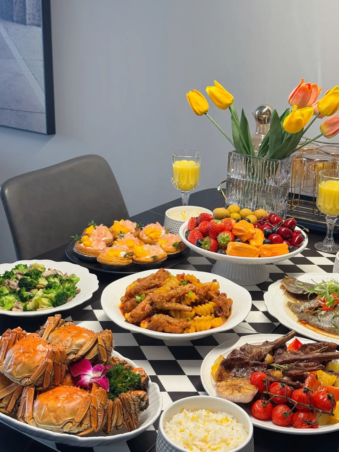 我会去市场挑最新鲜的瓜果蔬菜🥬 活蹦乱跳的海鲜🦐 用漂亮的餐具精心的摆盘🍽️ 我们不用端着架子聊天,就围坐在桌旁,聊聊趣事 吃到撑了就瘫在沙发上,吃着水果看剧📺 生活哪有那么多轰轰烈烈,不过是和三五好友,吃一顿热气腾腾的漂亮饭[红色心形R] 今日菜单 [庆祝R]酱香虎皮鸡爪 [庆祝R]清蒸大闸蟹 [庆祝R]时蔬烤战斧小羊排 [庆祝R]西兰花炒口蘑 [庆祝R]清蒸多宝鱼 [庆祝R]杨枝甘露蛋挞 [庆祝R]果盘:草莓、车厘子、菠萝蜜、蓝莓、龙眼