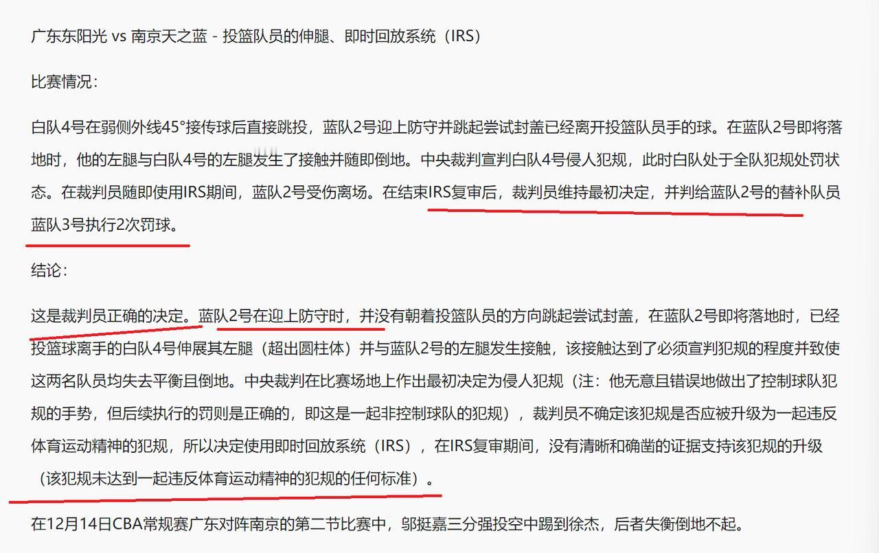 CBA裁判报告:邬挺嘉对徐杰的伸腿动作,并没有造成违体犯规,裁判吹罚正确! 12月22日,篮协公布了CBA判罚案例解析,广东队与同曦队的比赛,同曦队球员邬挺嘉,在投篮之后对徐杰有一个伸腿动作,从而导致徐杰失去身体平衡倒地,随后徐杰也是受伤提前结束了本场比赛。从篮协公布的CBA裁判报告内容显示,当值裁判吹罚邬挺嘉犯规是正确,他没有还造成违体犯规。 邬挺嘉在比赛中对徐杰的犯规,在赛后,引起了很多球迷讨论,很多人都认为裁判对邬挺嘉的判罚太轻了,应该给邬挺嘉一个违体犯规。毕竟,邬挺嘉的动作太恶劣了,造成了徐杰受伤严重,还到医院缝了几针。 不过,徐杰是一个非常大度之人,并没有指责邬挺嘉,而是选择原谅他了。随后,两人也是十分友好地化解了矛盾!与此同时,徐杰还表示这是小事,在篮球场上,也是经常发生的事情,没有必要过度解读。 针对此事,篮协方面也是进行了分析,认为徐杰在防守的时候,起跳时,并没有朝着投篮球员的方向,并且,在落地的时候,皮球已经离开了邬挺嘉的手,此时,邬挺嘉伸出来的腿与徐杰发生了接触,导致两个人都失去了平衡倒地。当时,裁判吹罚了邬挺嘉一个普通犯规。 当时,裁判员并不能够完全确定邬挺嘉是否构成违体犯规,于是,就进行了录像回放,通过录像回放认为邬挺嘉没有违体犯规,因此,吹罚了一次普通犯规。 CBA裁判报告认定,当值裁判的吹罚是正确的,因为,邬挺嘉的这次犯规,没有达到违体犯规的任何标准。 实话实说:不管怎么样,篮协此番能够正面回应CBA比赛中的争议判罚,这一点很难能可贵。在此,也是希望CBA裁判报告可以坚持下去,别搞一下就没了。那么,各位看官,您对此事有什么看法呢?