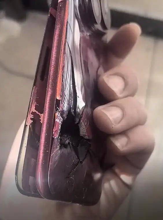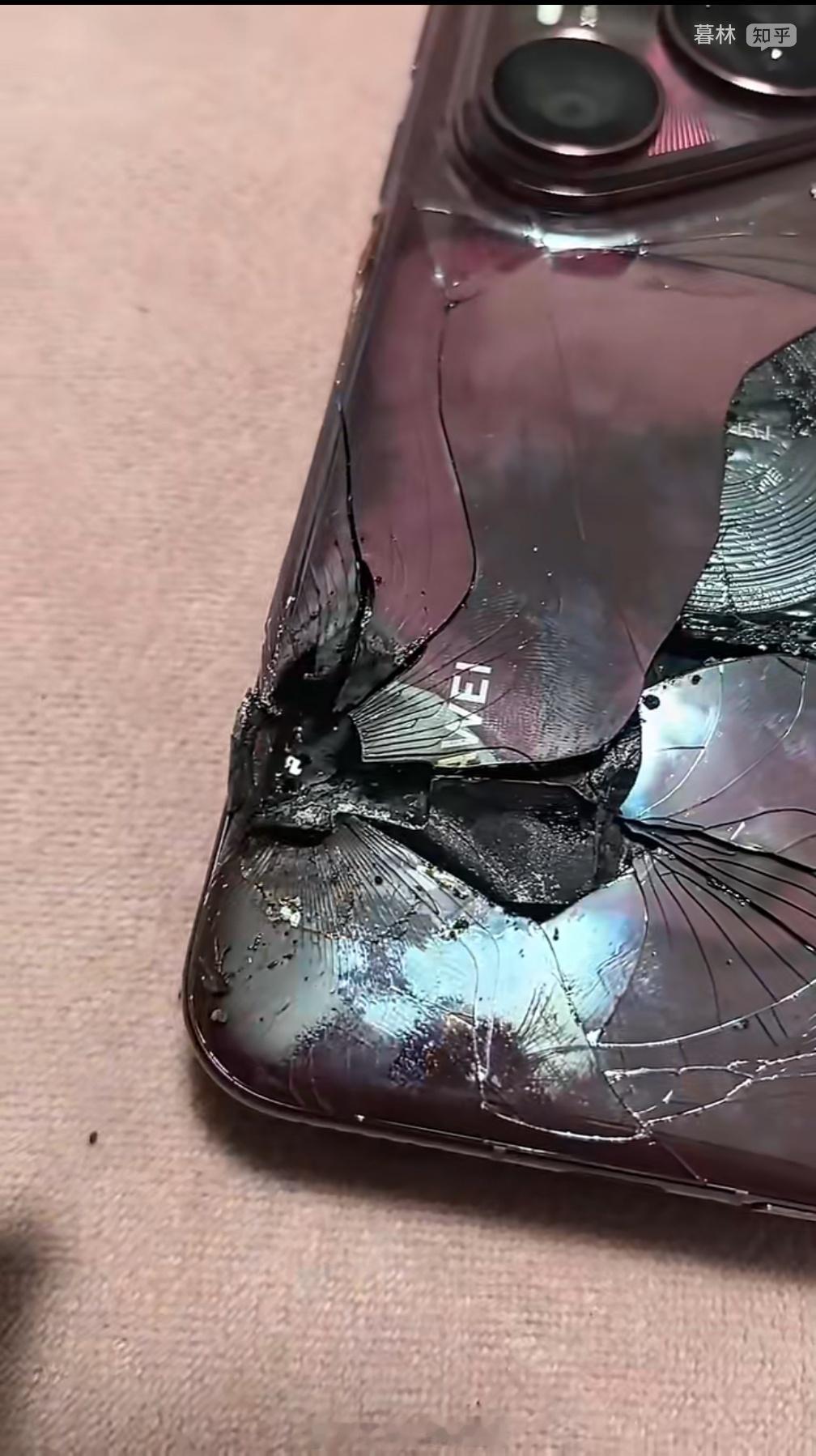华为Pura80Pro+新机充电电池爆炸这个明显就是人为的呀。这个真有点侮辱人智商了,你说这是挡子弹可能还有人信。啥手机电池出问题会把后壳的玻璃给搞成这种单点破碎还有放射状裂纹。手机电池出问题通常是先鼓包把后壳顶起来,因为后壳的强度比边缘胶水粘的强度高多了,有了释放的口会放气泄压,或者再激烈点有火苗。所以一般情况自燃的手机都是有边翘起但是后壳不会单点破碎,有放射状裂纹的,这就是被硬物碰到了。