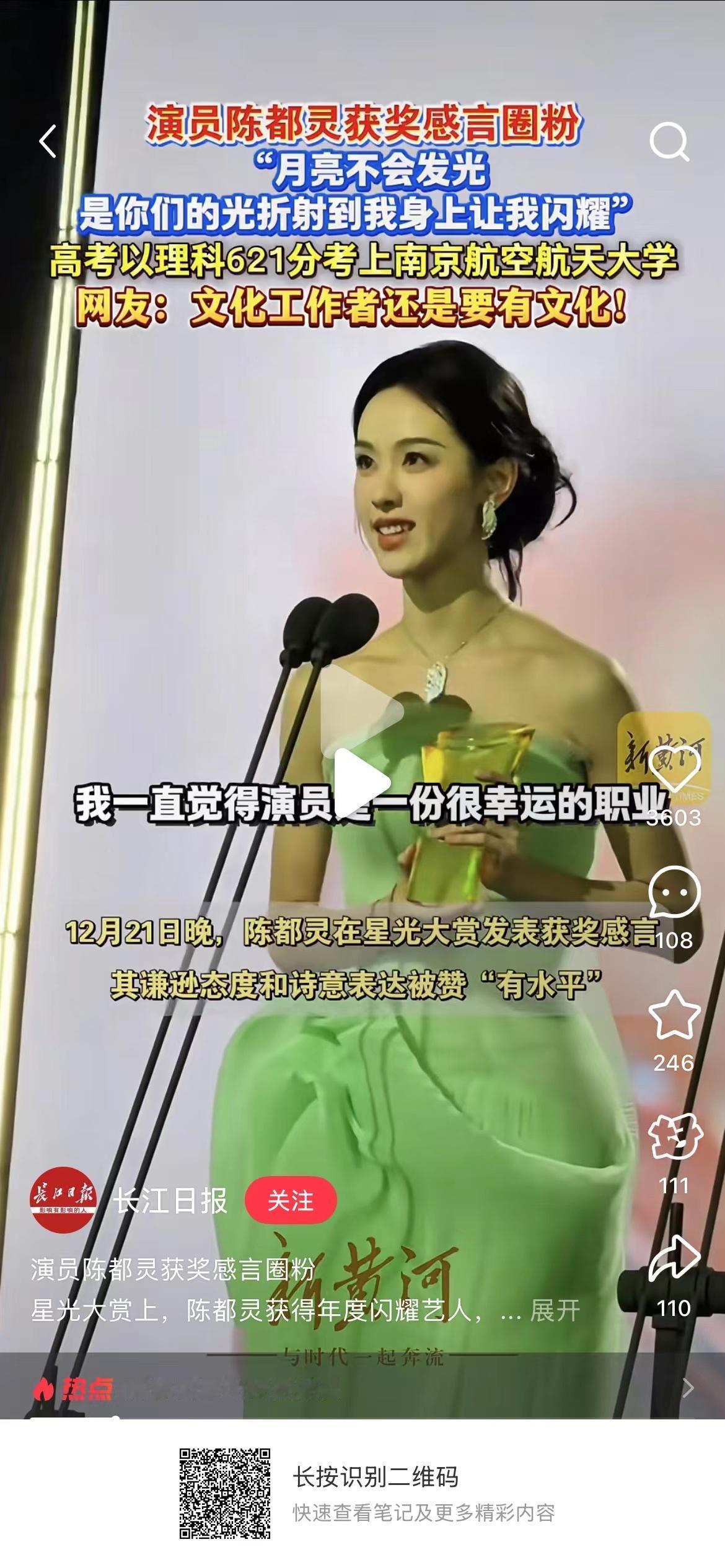 这个陈都灵是南京航空航天大学毕业的,专业是发动机专业,结果她没有去搞飞机发动机去做了演员,然后她拿了一个什么奖我觉得她讲的话也太搞笑了。她说什么观众的光折射到她身上,所以她拿了奖,我觉得你凭什么拿奖是最主要的问题,你又不是演员专业毕业的,你又拿了奖,你靠的是什么?你只不过是一个花瓶而已。如果你在你学习的专业拿了奖是正常的。你以为谁都可以当演员吗?