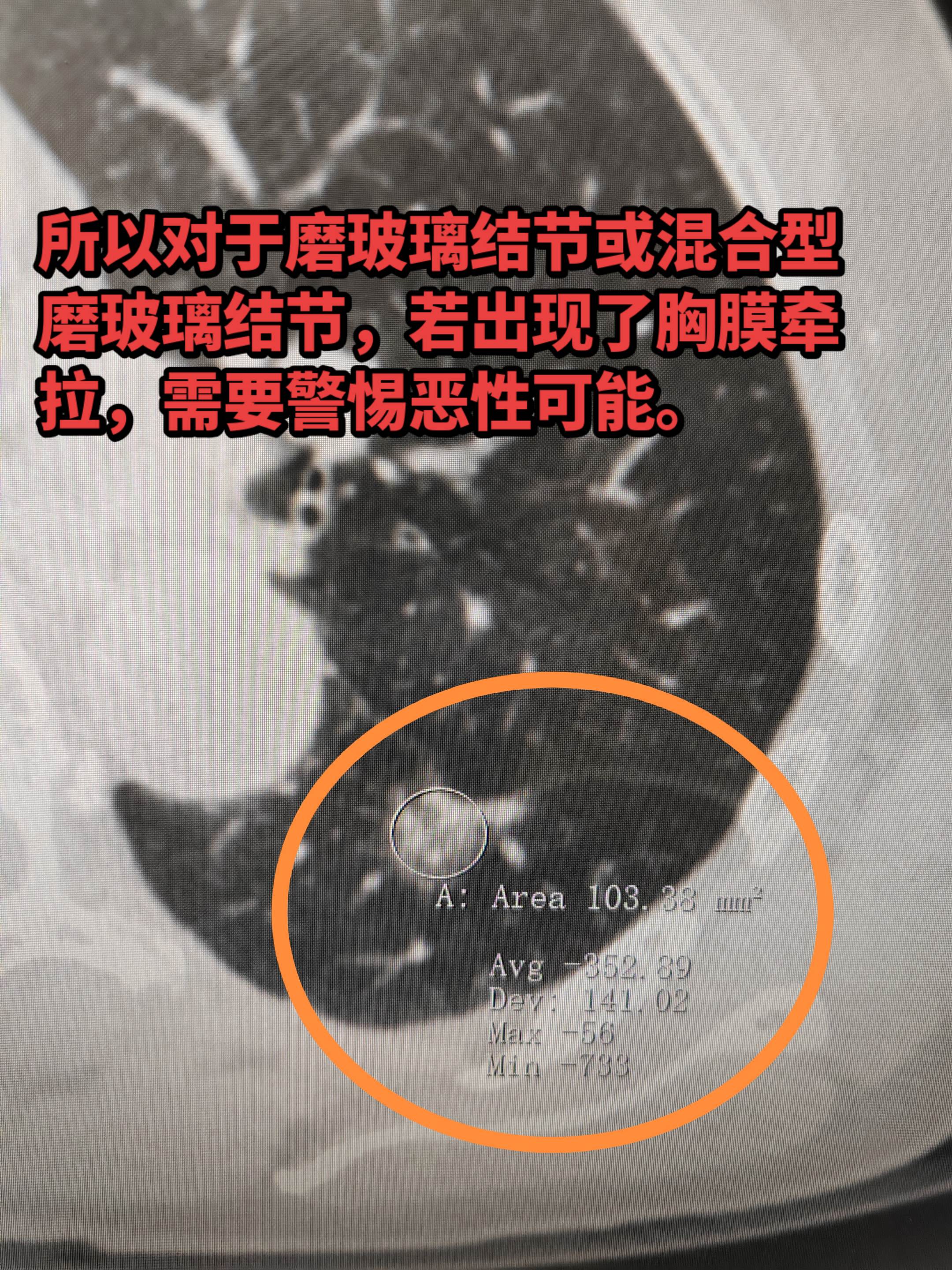磨玻璃结节出现胸膜牵拉需警惕!该患者体检偶然发现左下肺磨玻璃结节,整体密度偏高,有明显胸膜牵,高度怀疑恶性。像这类密度偏高的磨玻璃结节,若是炎症一般是短期内形成,多不会形成胸膜牵拉特征。而肿瘤性的则不一样,此类结节由于已存在很时间,肿瘤导致肺泡塌陷而出现胸膜牵拉。所以对于磨玻璃结节或混合型磨玻璃结节,若出现了胸膜牵拉,需要警惕恶性可能。