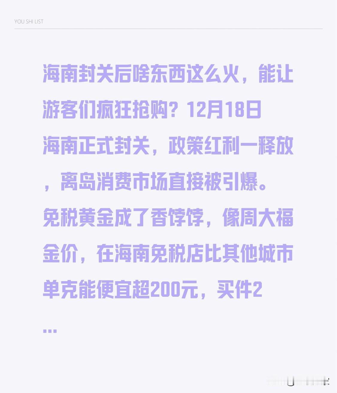 海南封关后啥东西这么火,能让游客们疯狂抢购?12月18日海南正式封关,政策红利一释放,离岛消费市场直接被引爆。免税黄金成了香饽饽,像周大福金价,在海南免税店比其他城市单克能便宜超200元,买件20多克金饰能省4000多元,不少人还摸索出了“最优凑单攻略”。热带鲜果也不甘示弱,新鲜榴莲等强势跻身“必买清单”。不过律师提醒,“囤货转售”行为合不合规还得注意。 你想去海南买免税黄金和热带鲜果吗?会担心“囤货转售”的合规问题吗?你觉得海南封关还会带火哪些商品呢? 海南封关 海南自贸区封关 海南封关创业 海南封关税收 封关海南 海南封封关 海南封圈 海南岛封关买房 海南自贸区封关 海南封关创业 海南封关税收 封关海南 海南封封关 海南封圈 海南岛封关买房
