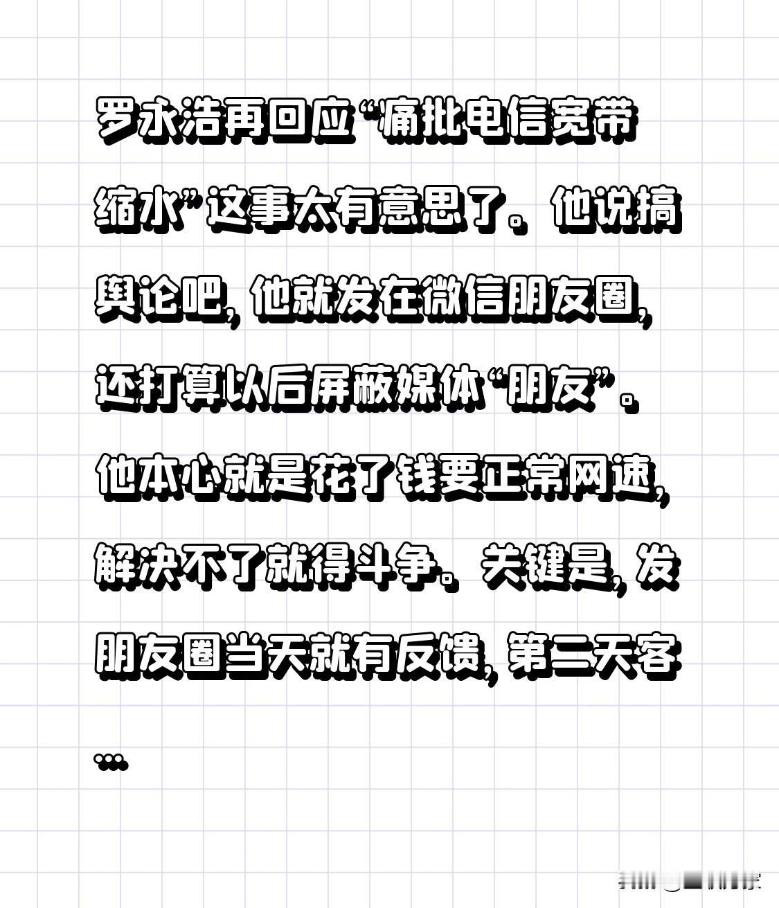 罗永浩再回应“痛批电信宽带缩水”这事太有意思了。他说搞舆论吧,他就发在微信朋友圈,还打算以后屏蔽媒体“朋友”。他本心就是花了钱要正常网速,解决不了就得斗争。关键是,发朋友圈当天就有反馈,第二天客服就来了,现在网速快得让人惶恐。 这就让人思考,为啥罗永浩一发声就有这效果,普通网友找客服能有这待遇吗?要是普通网友也能这样,那才是真的公平。不知道大金又会有啥状况,大家觉得普通网友该咋维权呢? 5G真相定律 电信网络吐槽 垃圾电信网速 网速真相 电信宽带退订 电信消费误区 电信网络吐槽 垃圾电信网速 宽带退网