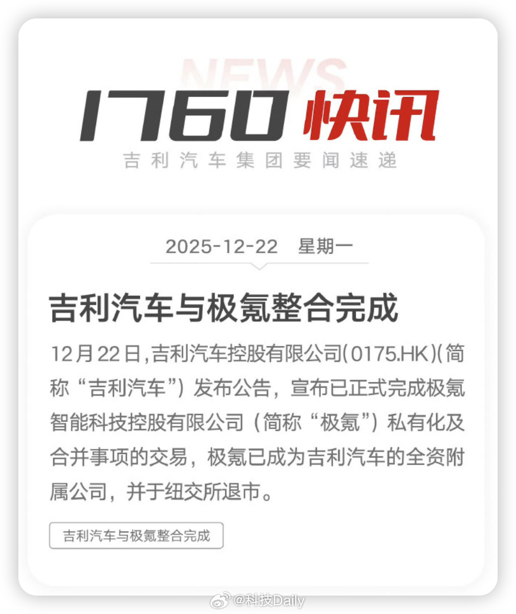 一个吉利共同发力!吉利汽车与极氪整合完成,极氪智能科技控股有限公司已成为吉利汽车的全资附属公司,并于纽交所退市。新起点,新发展,集吉利创新为一身!