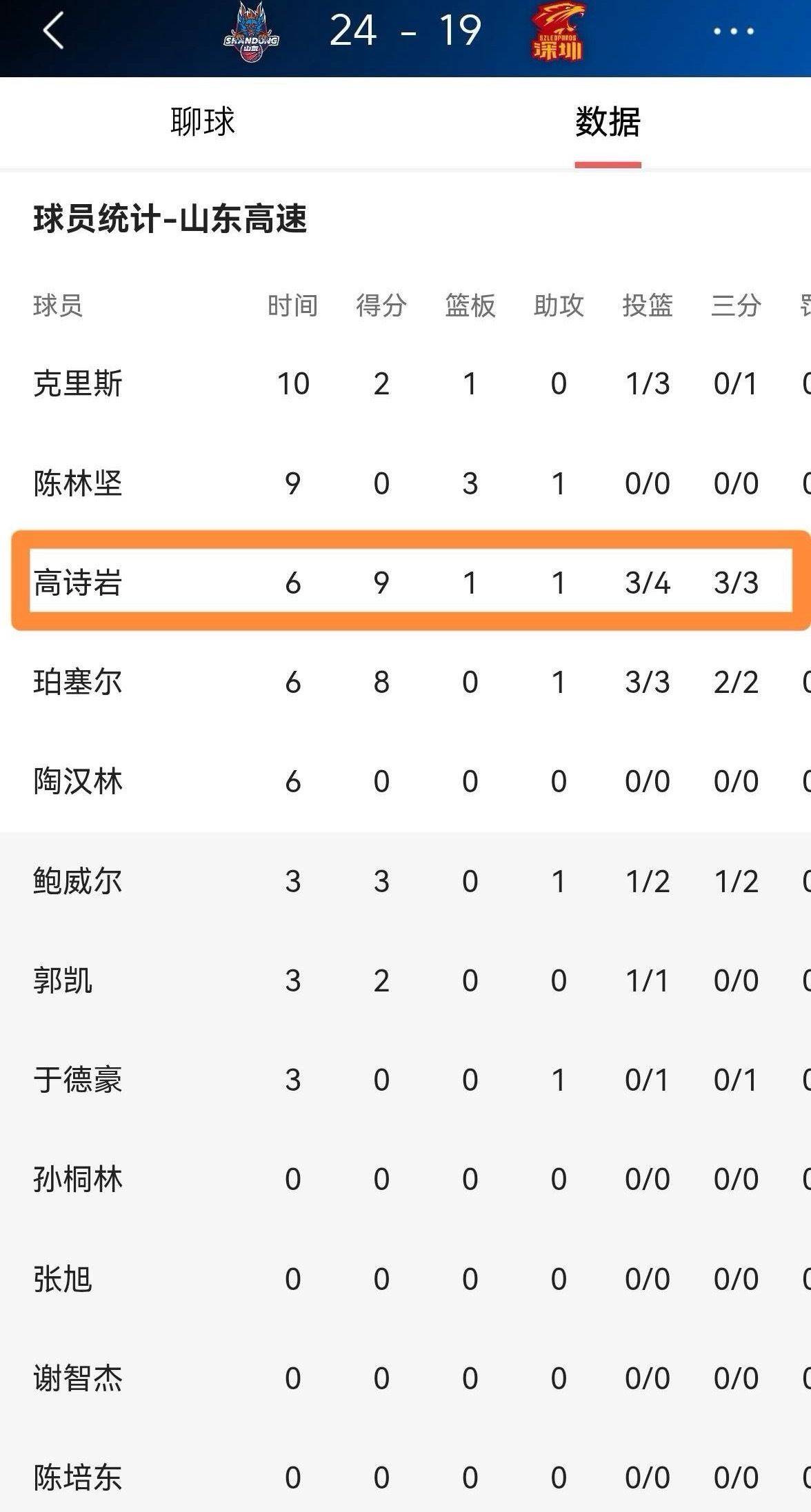 山东高速当家后卫高诗岩真是让人大吃一惊!在今天山东高速主场迎战深圳马可波罗的比赛中,目前双方的第一节比赛已经结束,山东高速以24:19领先对手。让人感到特别意外的是,向来不擅长投射的高诗岩在首发出战的6分钟里,三分球3中3砍下9分,还有1篮板1助攻,他的场上正负值为+6。我相信高诗岩在第一节比赛中的精彩表现不仅让我大吃一惊,而且让山东高速的主场球迷同样大吃一惊。