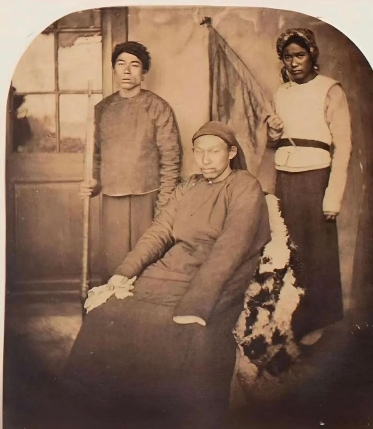 目前唯一一张公开的太平天国封王照!据说是,照片中心人物为太平天国戴王黄呈忠。见下图,此人一看面相就不好惹。照片的拍摄者是乔治·哈特,是一名西方传教士。史载黄呈忠1826年生人,清末广西人,参加太平军,后隶李世贤部,骁勇善战,屡立战功,于1861年12月9日率兵攻占宁波,占领宁波后,黄呈忠"申愿"太平军对英、美、法外国人"福礼修好",划定外侨商务区,禁止两军侵犯。后来又于1866年2月,率兵从广东进击福建漳州,5月失守,后来不知所踪…