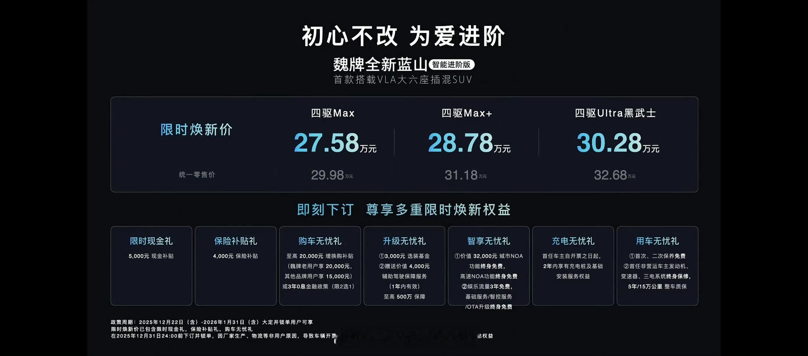 魏牌全新蓝山智能进阶版上市,限时售价 27.58 万-30.28 万,首搭长城 VLA 大模型,辅助驾驶能力这块提升很大。这价格可还行?