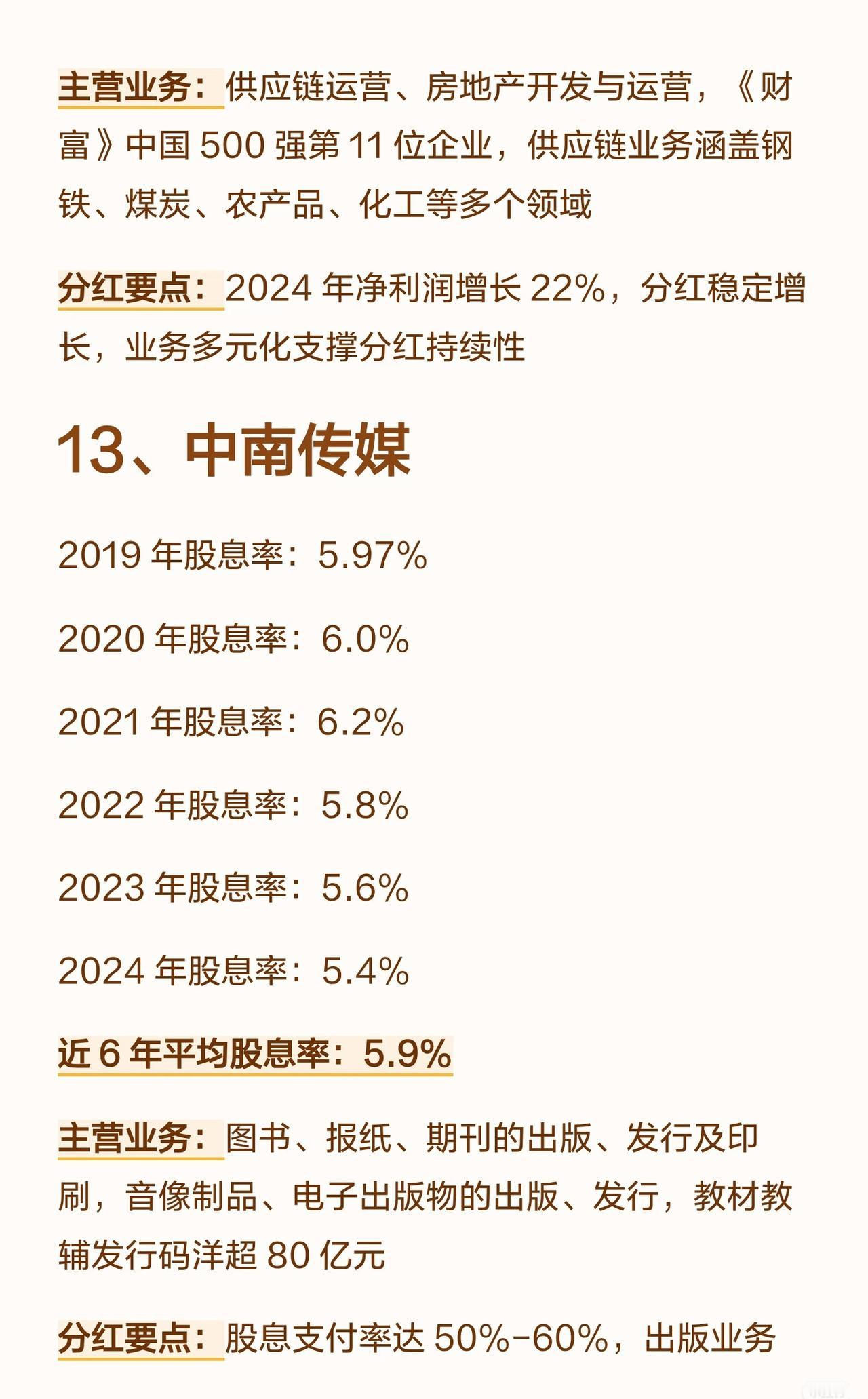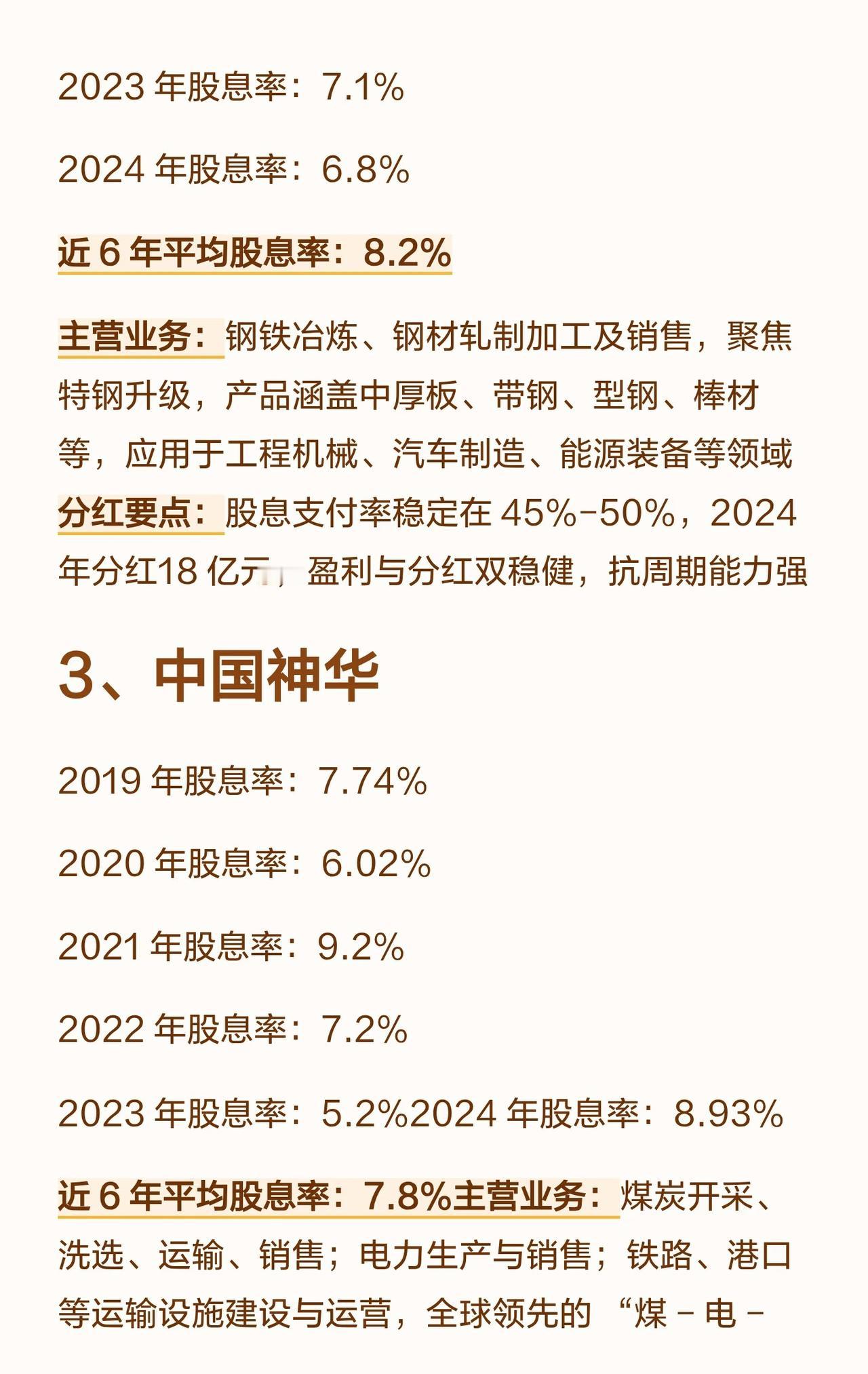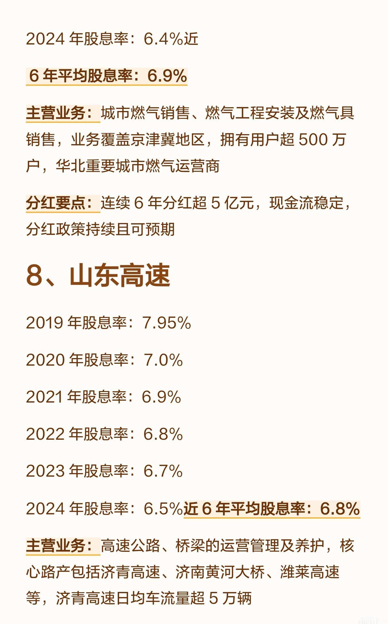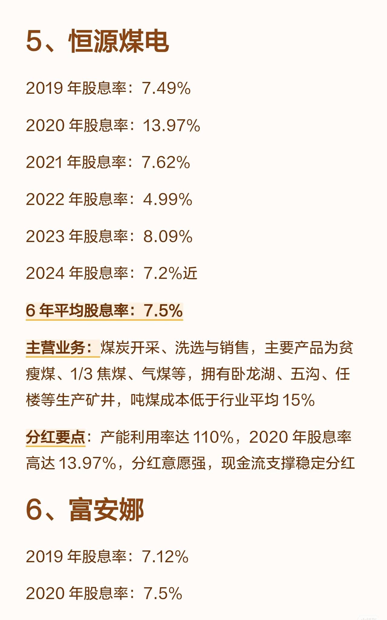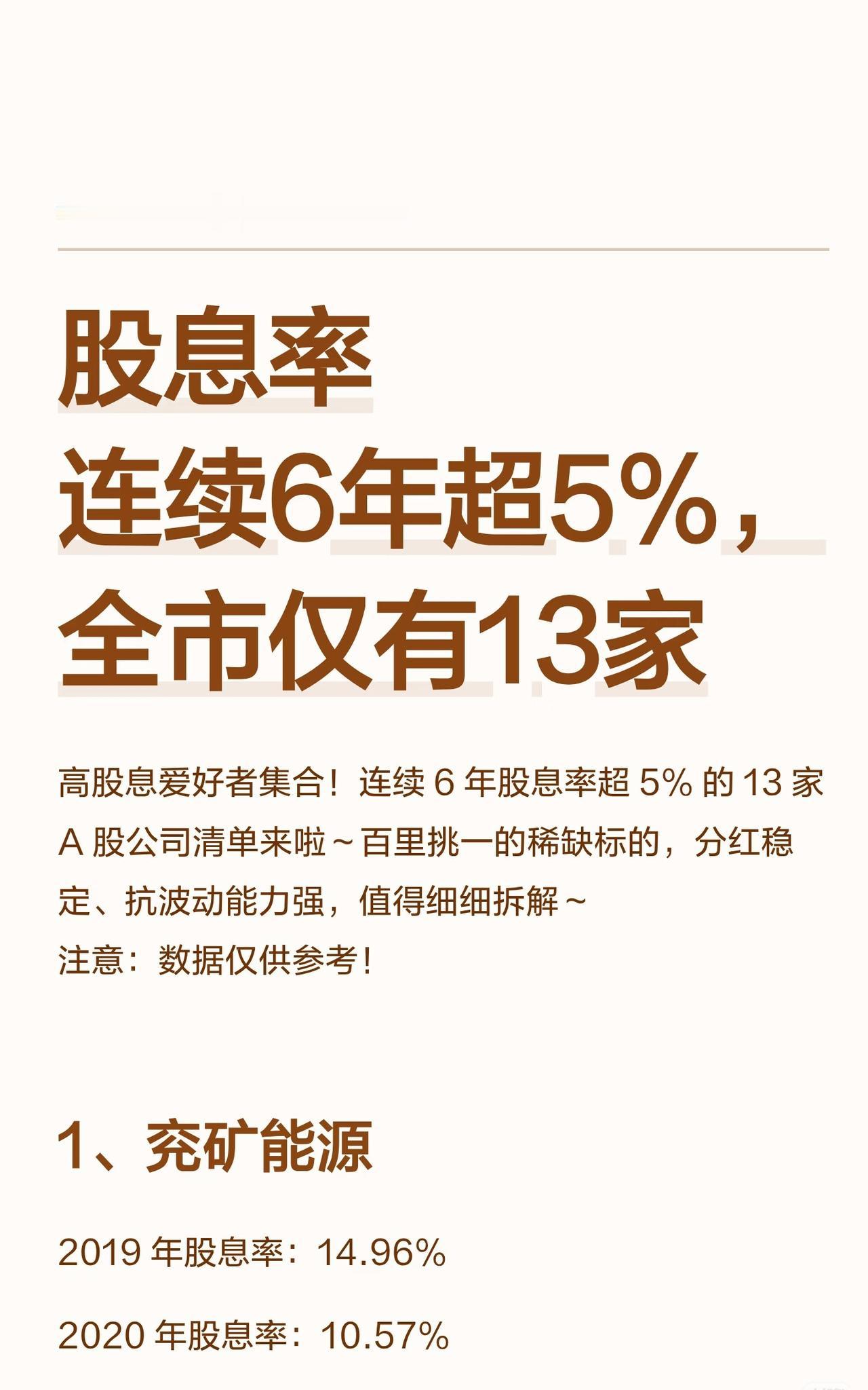 聚焦A股市场,梳理出仅有的13家连续6年股息率超5%的稀缺高股息公司,涵盖煤炭、纺织、燃气、高速、银行、贸易等行业,如兖矿能源、中国神华等,附各公司2019-2024年股息率数据、主营业务及分红特点(如连续高分红、分红率稳定等),为高股息爱好者提供标的参考。