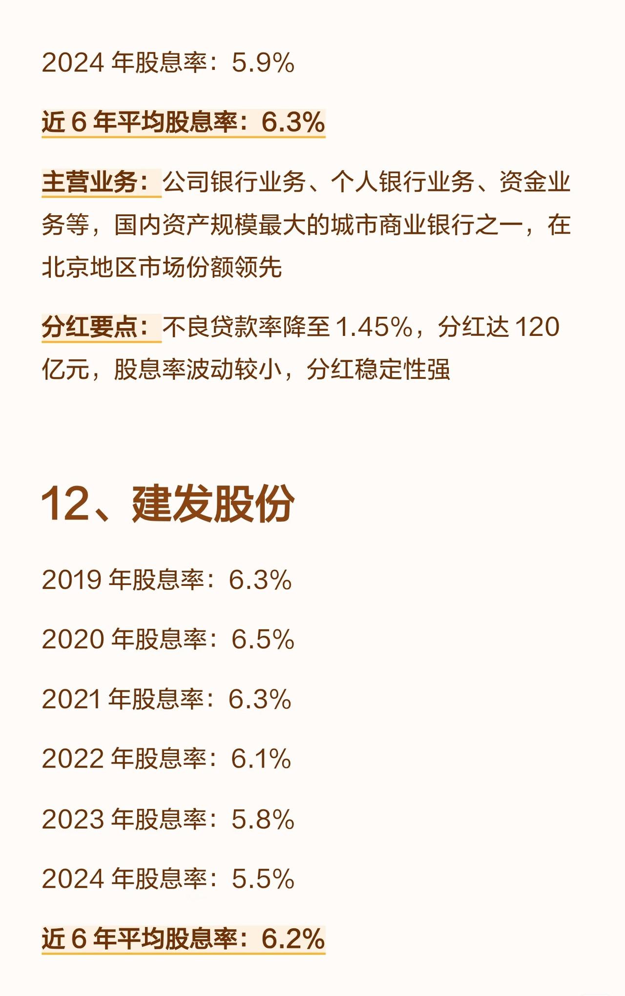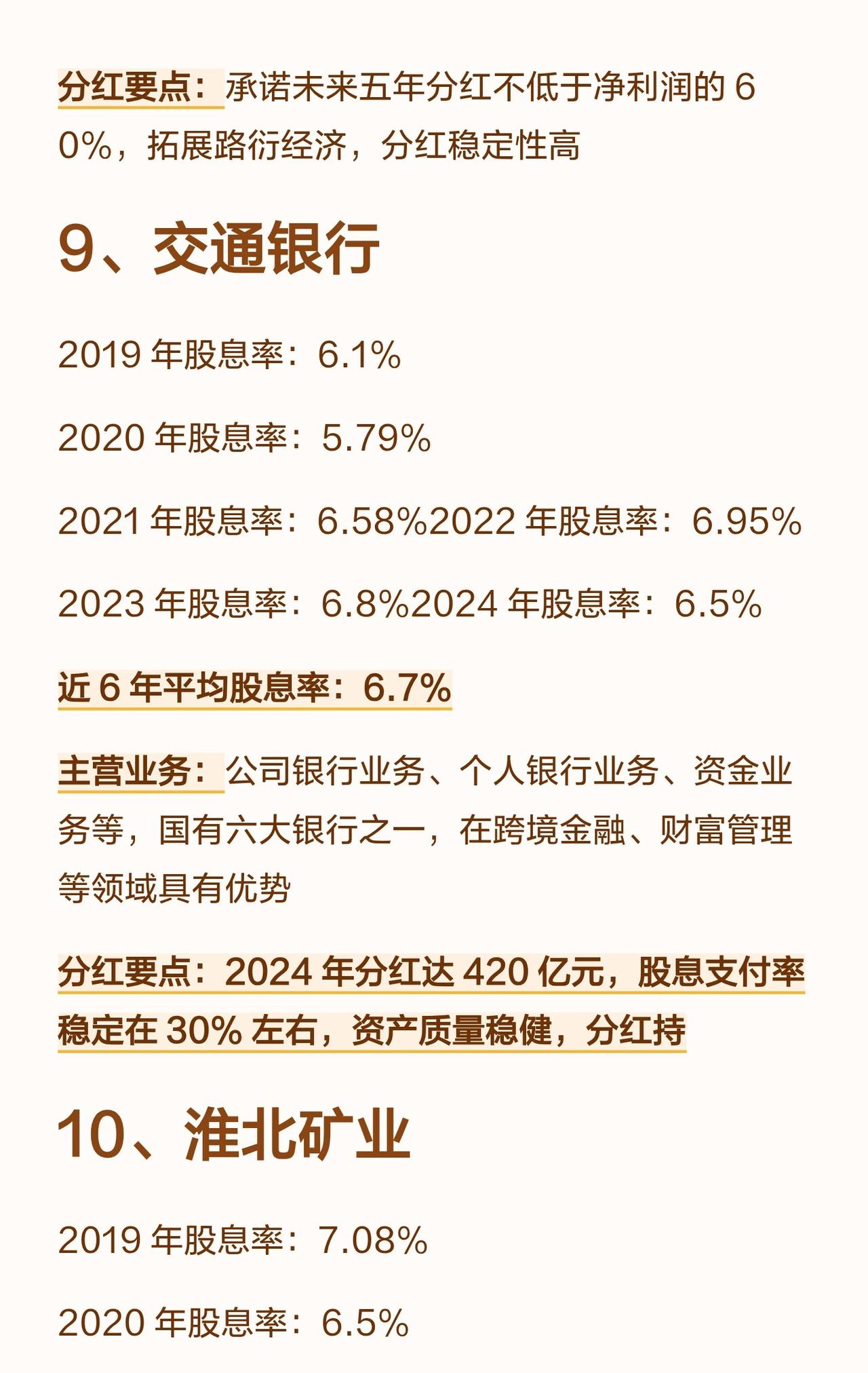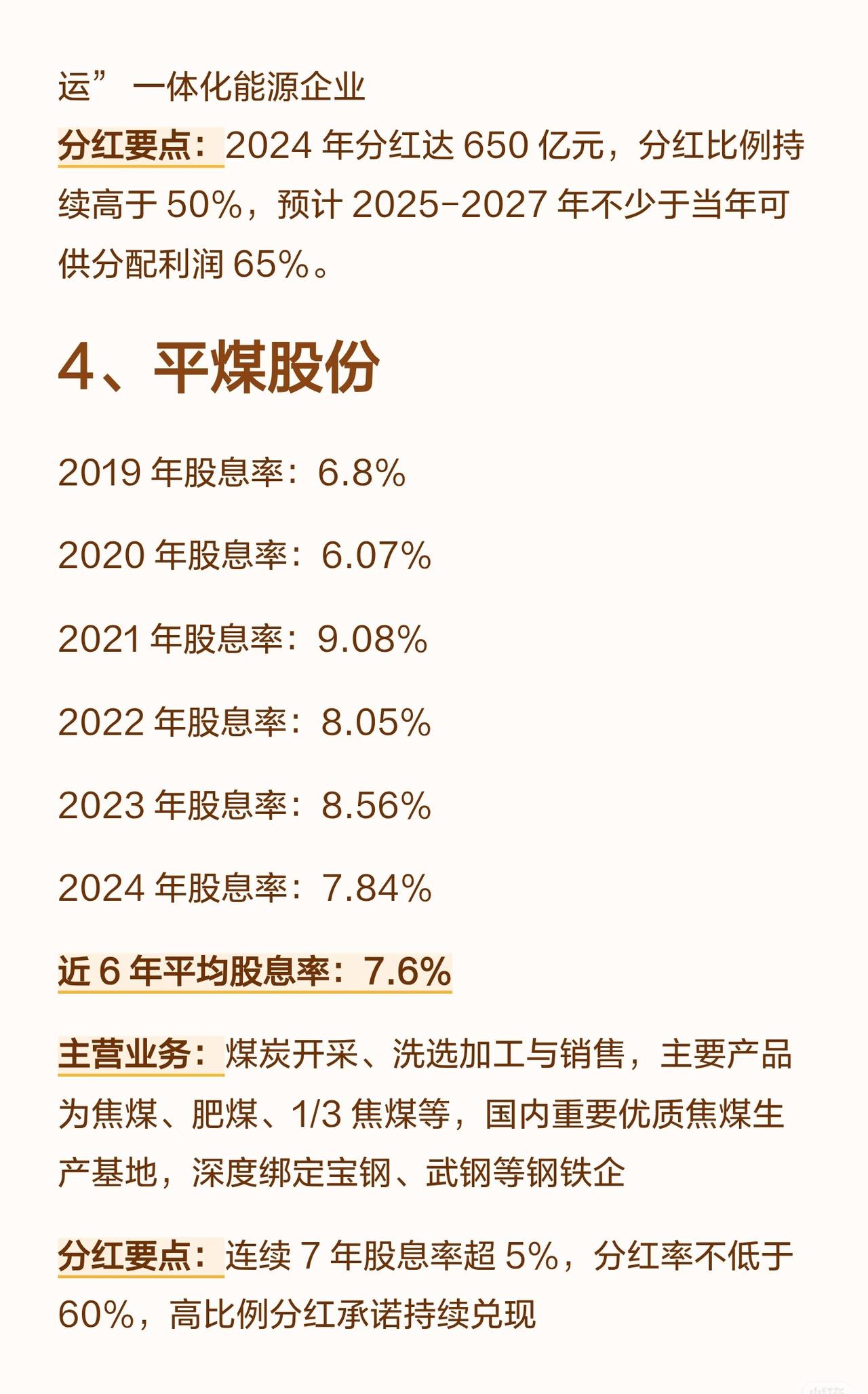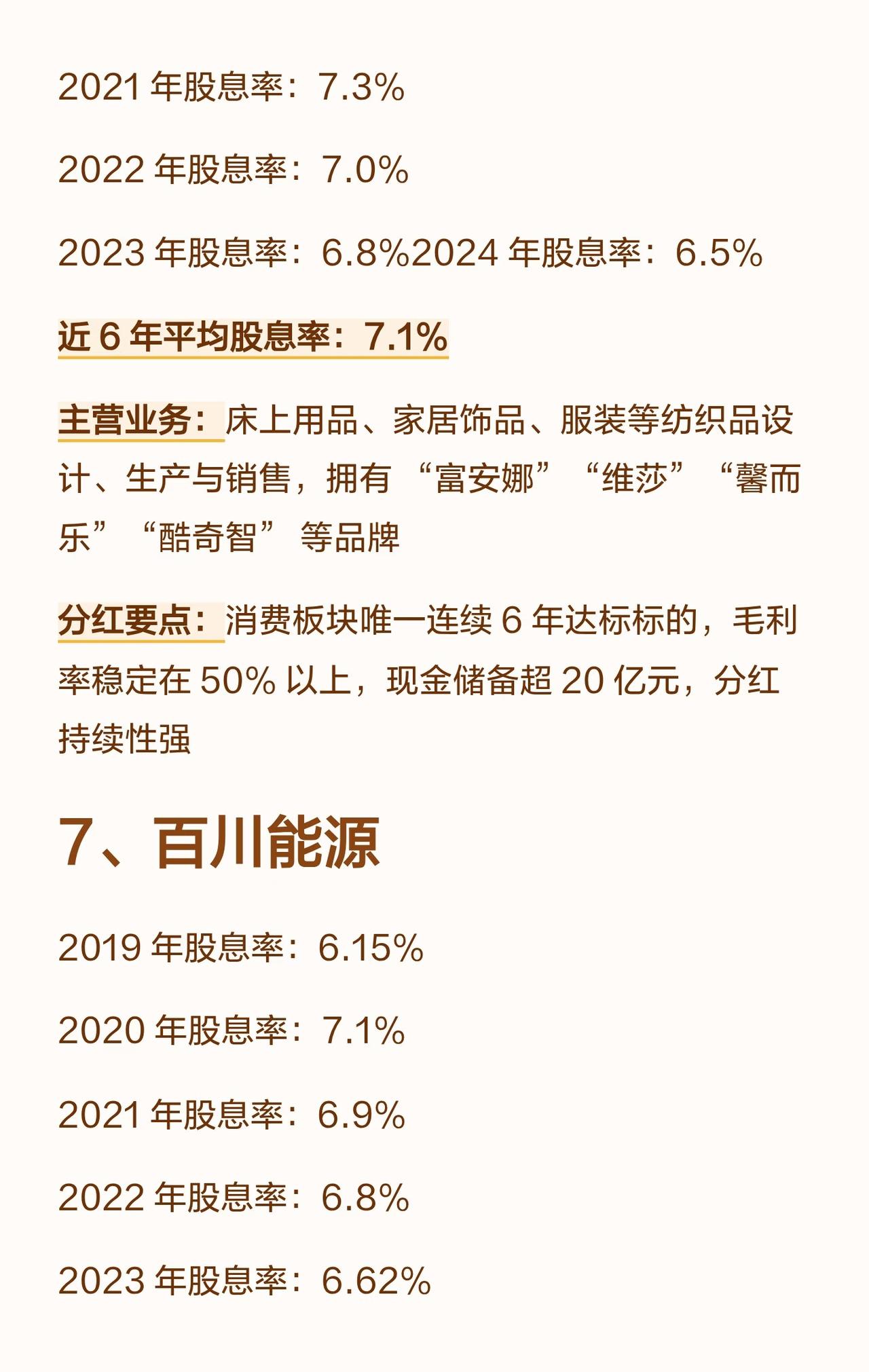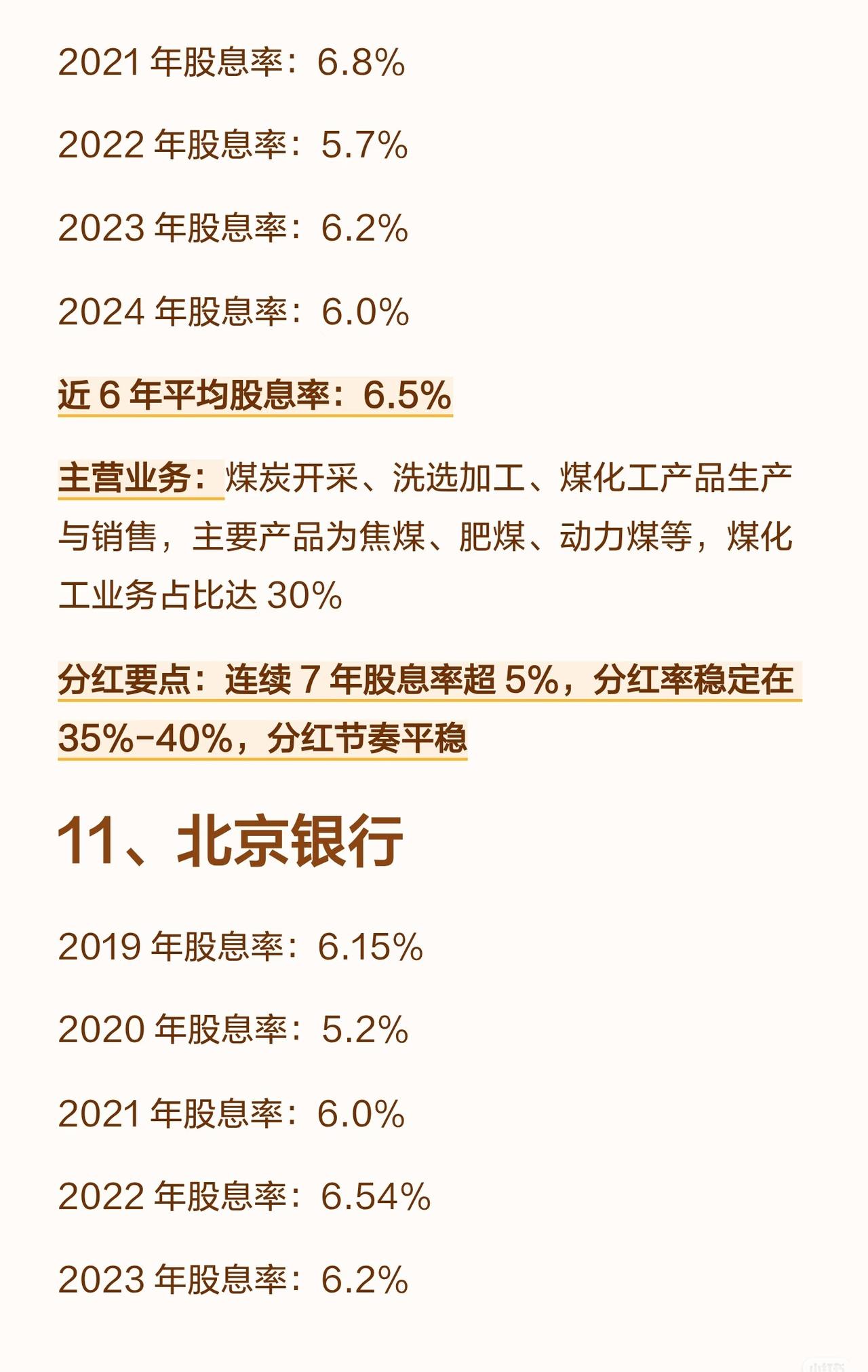 聚焦A股市场,梳理出仅有的13家连续6年股息率超5%的稀缺高股息公司,涵盖煤炭、纺织、燃气、高速、银行、贸易等行业,如兖矿能源、中国神华等,附各公司2019-2024年股息率数据、主营业务及分红特点(如连续高分红、分红率稳定等),为高股息爱好者提供标的参考。