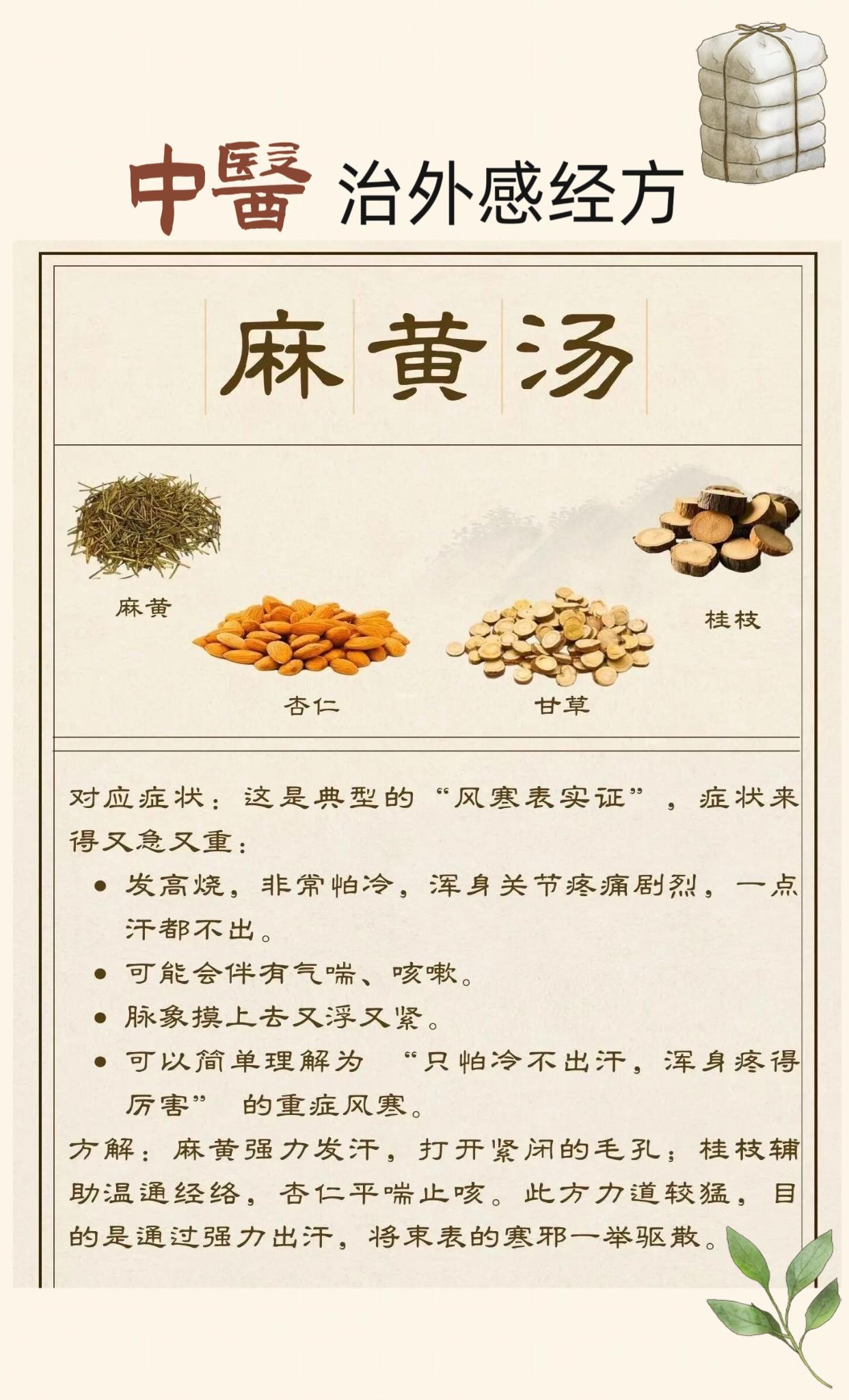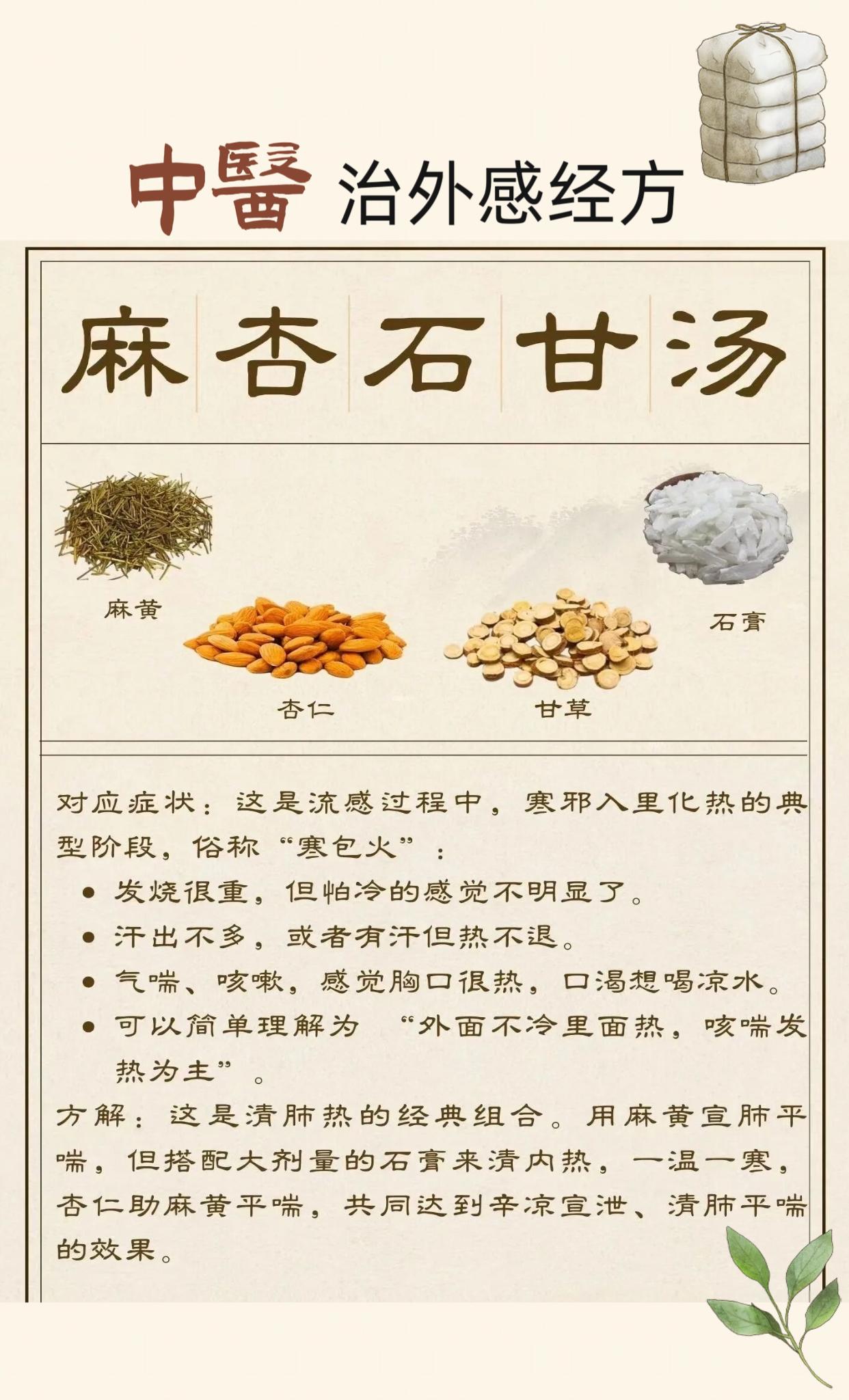 中医治外感四大经方。麻黄汤 桂枝汤 麻杏石甘汤 小青龙汤