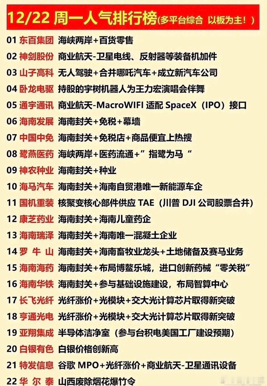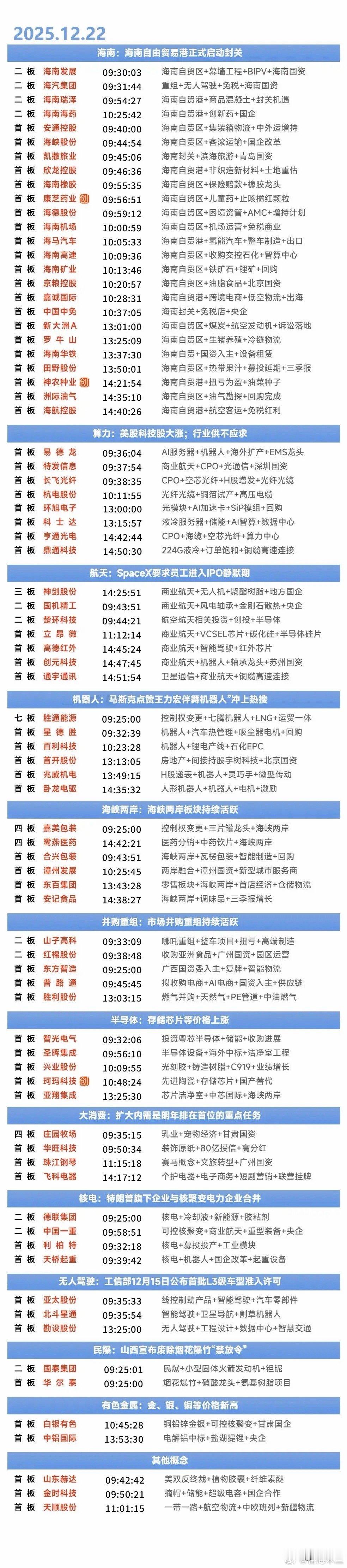 今日热点板块(12月22日,周一)商业航天概念反复走强:神剑股份3连板,国机精工2连板,北斗星通涨停,太钢不锈、盟升电子、成都华微、上海港湾、华力创通涨超5%。(据央视新闻报道,2025年12月20日20时30分,我国在文昌航天发射场使用长征五号运载火箭,成功将通信技术试验卫星二十三号发射升空,卫星顺利进入预定轨道,发射任务获得圆满成功。)卫星互联网指数强势拉升:北斗星通、中国卫星涨停,菲利华涨6.82%,天银机电涨5.70%,华力创通涨4.32%。光模块概念表现活跃:长芯博创涨超13%逼近历史新高,长光华芯涨超8%,仕佳光子、中际旭创、新易盛跟涨。(上海交通大学科研人员近日在新一代光计算芯片领域取得突破,首次实现了支持大规模语义媒体生成模型的全光计算芯片。)CPO板块午后持续走强:景旺电子、中际旭创涨超8%,环旭电子午后封板,东山精密、明阳电路、中天科技、新易盛跟涨。高速连接器概念持续走强:鼎通科技“20cm”涨停,长飞光纤涨停,长芯博创、致尚科技、华丰科技、胜蓝股份、奕东电子、金发科技等跟涨。机器人:安达智能20%涨停,精智达涨超18%,科达自控涨超15%,三丰智能涨超10%,国机精工、天桥起重、亨通光电、易德龙、卧龙电驱、星德胜10CM涨停,双飞集团、渤海汽车、科翔股份涨超9%,恒帅股份、三协电机、奕帆传动涨超8%,创元科技、上纬新材、海伦哲、长盛铀承涨超7%。(王力宏演唱会上宇树机器人的后空翻视频周末刷屏,马斯克转发该视频并留言)半导体板块持续走高:立昂微、珂玛科技涨停,微导纳米、源杰科技、汇成股份、裕太微、长川科技跟涨。零售概念延续强势:上海九百3连板,百大集团涨超8%,中央商场、浙江东日、东百集团、银座股份、利群股份、中国中免跟涨。(12月20日,商务部党组扩大会议在京召开。会议强调,大力提振消费,扩大优质商品和服务供给,释放服务消费潜力。)食品饮料板块尾盘异动:安记食品直线涨停,海欣食品、立高食品、安琪酵母、紫燕食品、好想你等跟涨。海南自贸区:海南发展2连板,康芝药业等20%涨停,海峡股份、洲际油气、海南瑞泽、海南机场、海汽集团,海德股份、凯撒旅业、海南橡胶、神农种业涨停,中钨高新、金盘科技、广晟有色等跟涨。