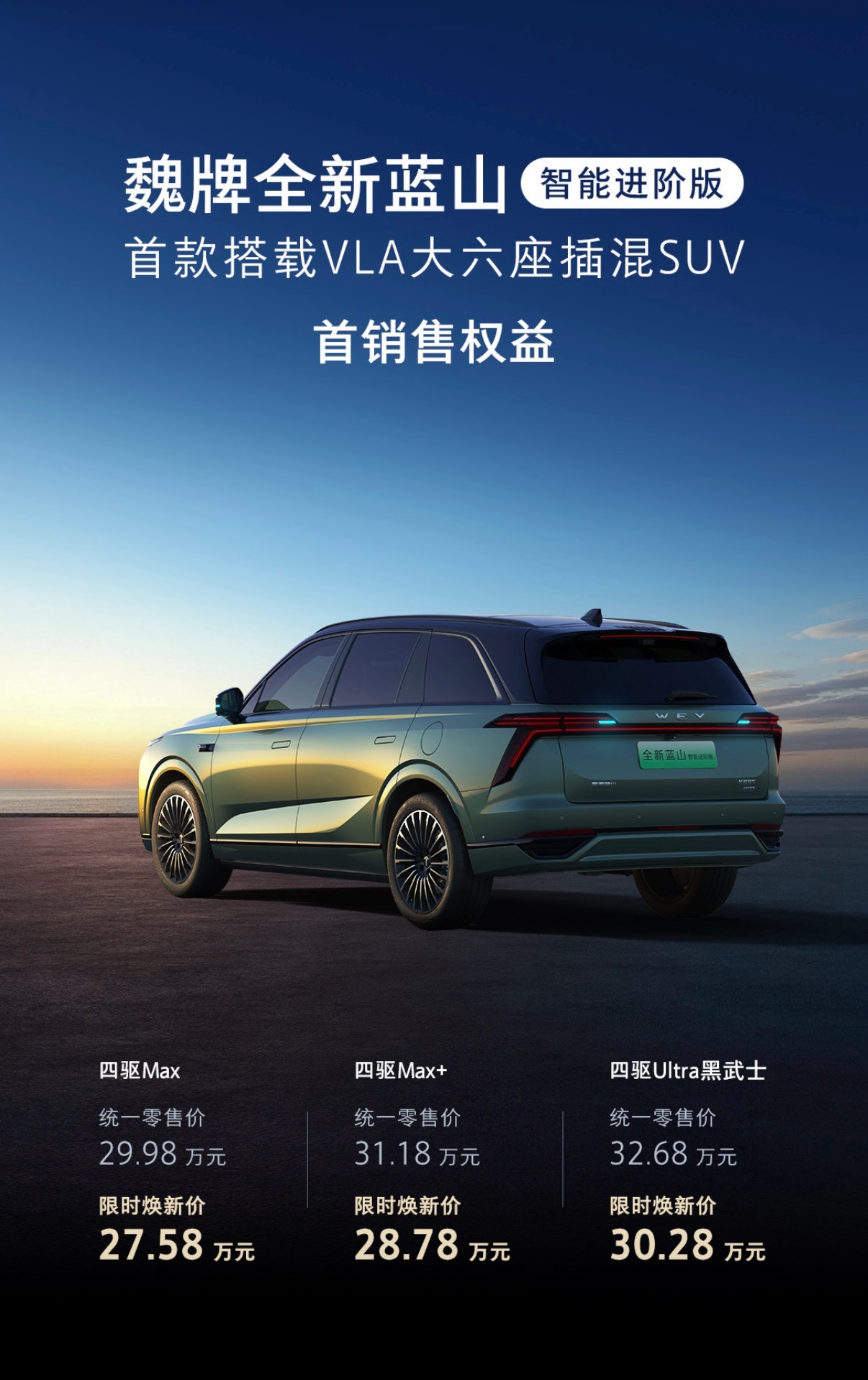 魏牌全新蓝山智能进阶版正式上市,首款搭载VLA大六座插混SUV限时权益开启!即刻下订,限时焕新价27.58万元起。